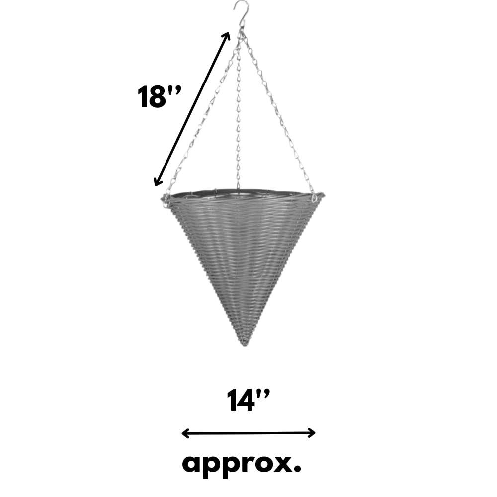 - Specifications - This outdoor hanging basket measures in at 38cm x 35cm x 35cm approximately and can hold upto 7.5L of compost. These cone shaped hanging baskets are made from hard wearing and durable rattan effect material, with a silver metal hanging chain and are grey in colour. These hanging baskets are pre-lined for easy planting.
