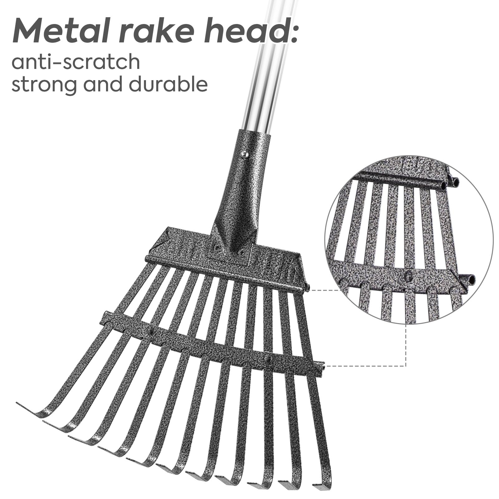 - Premium Material: Metal-made garden leaf rakes are more durable than plastic rakes. 11 tines allow you to work on your lawn and garden without rake teeth falling off, damage, breaking and corrosion.