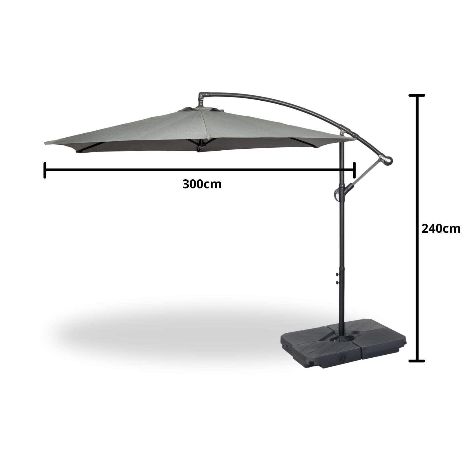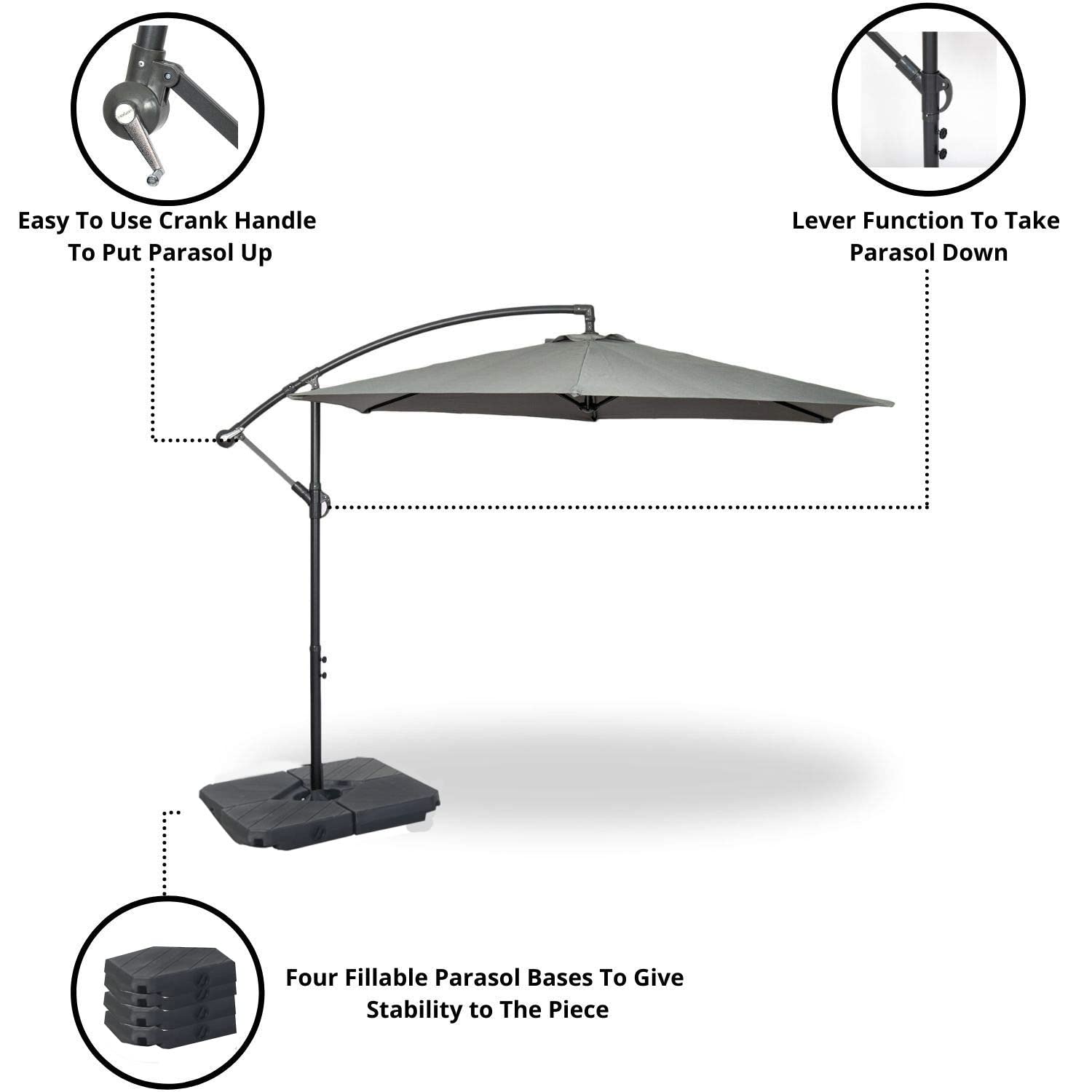 - COVER AND BASES: The cantilever parasol comes with all the pieces you need to fully get the best out of the piece. Featuring a great PVC coated cover for when you are not using the piece. Also 4 fillable bases which allow you to weigh the gazebo down when full of sand or water.