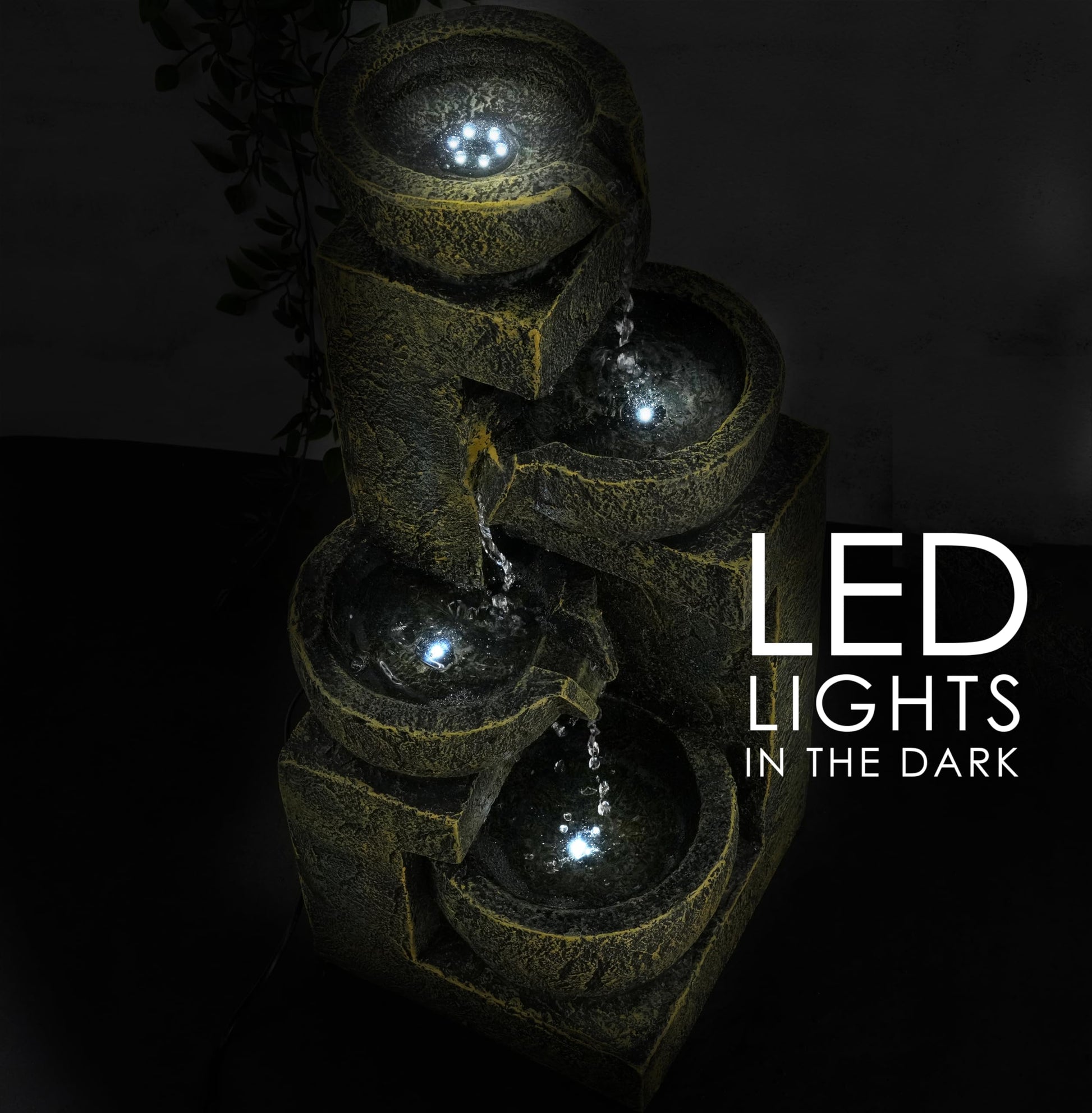 - RUSTIC 4-TIER CASCADE DESIGN: This garden water feature showcases a beautifully crafted rustic design with four cascading bowls, each gently flowing into the next. The warm, earthy tones give it a timeless appeal, while the integrated LED lights in each bowl create a mesmerizing night-time display.