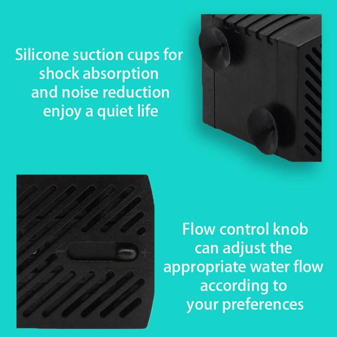 - 【Powerful Water Pump】 Wattage:3W, max lift height: up to 0.55m,max flow rate: 180L/H,An adjustable knob to control the water pressure, providing a different water flow effects as you your needs. Suitable for fish tank, small to medium size aquarium, pond, garden fountain, flowing water crafts and hydroponic systems.