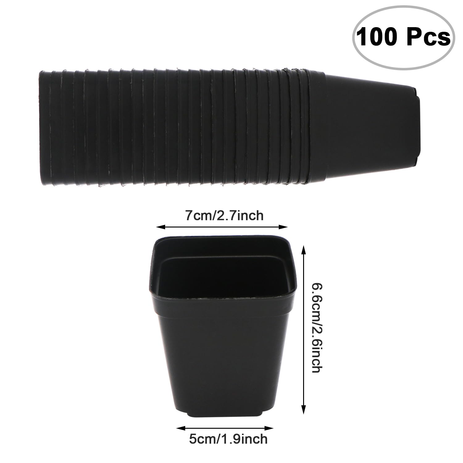 - Package Contains: 100 Pcs plastic starter pots, each pot: 2.7 inch (opening) x 1.9 inch (bottom) x 2.9 inch (height).