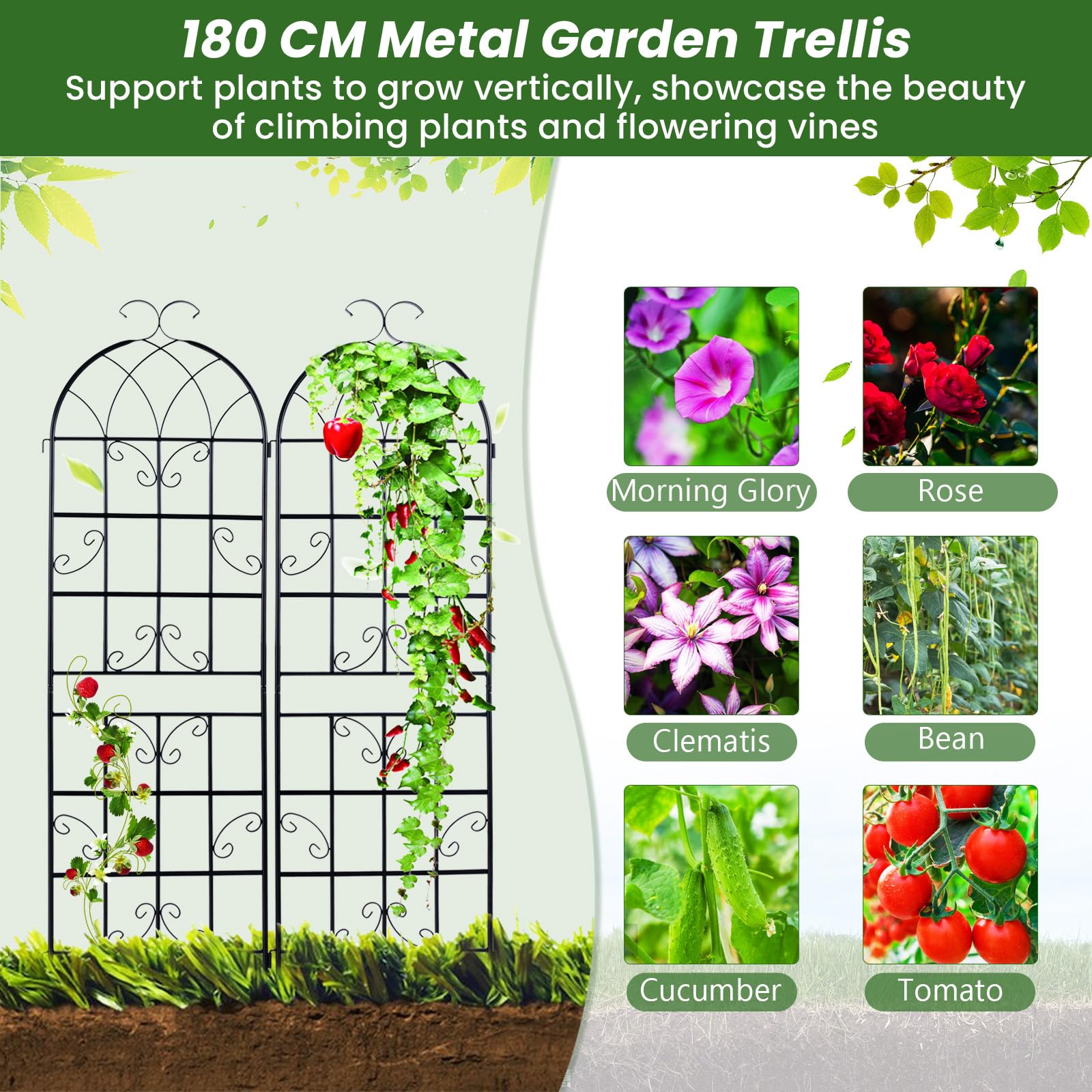 - Ample Space for Vertical Growth: Measuring 180/220 cm in height, the plant trellis offers a generous climbing area, providing ideal space for your climbing vegetables, vines and flowers to grow upward. By allowing your plants to reach for more sunlight, they can thrive and flourish in their vertical growth.