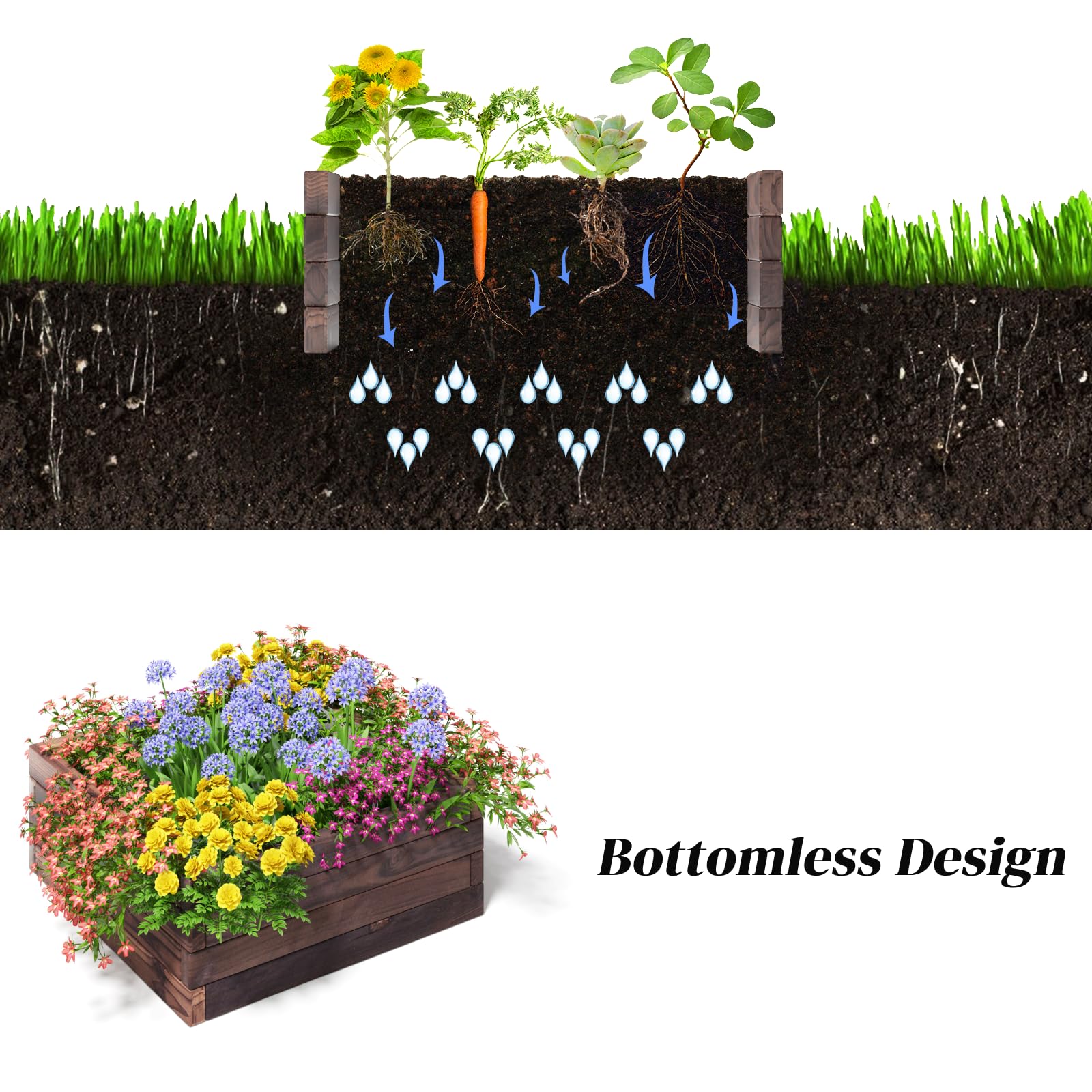 - Thoughtful Bottomless Design: This wooden planter box features an open bottom design that makes excess water drain away easily, and the roots of plants can extend freely to absorb more nutrients from soil.