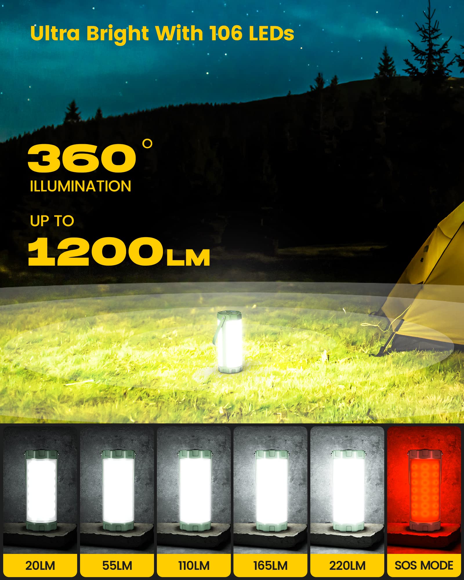 - [Ultra Bright 1200LM & 5 Brightness Levels] With 106 evenly distributed LEDs covering the entire camping lighting body in 360 degrees, it illuminates your surroundings with exceptional brightness and uniformity, eliminating any shadows for clearer views. 5 brightness dimmable for your various lighting needs. In emergencies, the "ultra bright" mode emits 1200LM for 3-min to cover a wider area. Essential lanterns for the darkest & stormiest nights.