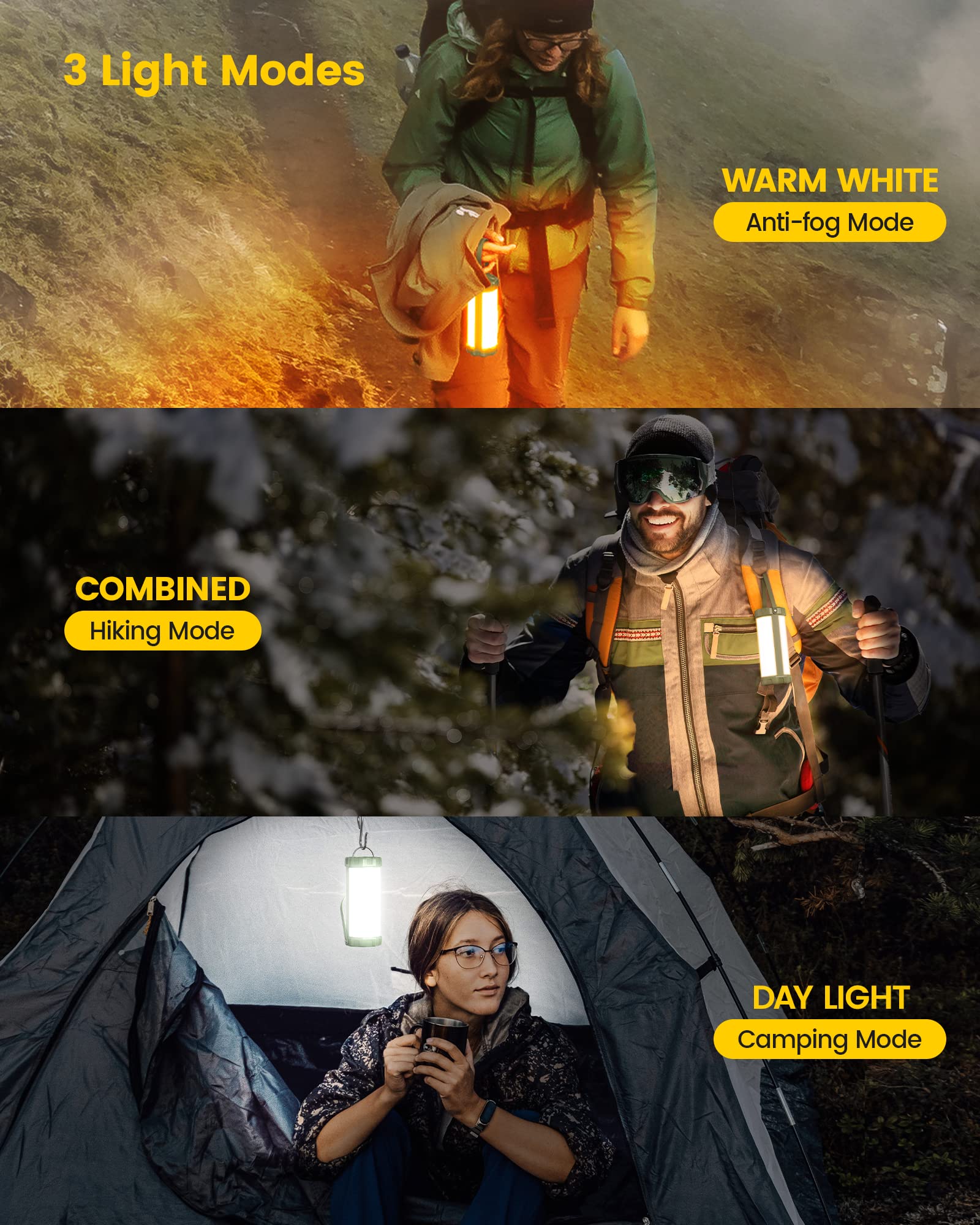 - [3 Light Modes & SOS Mode] We design this camping light with 4 light modes to suit your needs, including 3000K, 4000K,6000K & SOS mode. Specifically, the 3000K is mainly for lighting in the thick fog; the 4000K is for walking or hiking; the 6000K is for repairing or illuminating a broader area like a tent or campsite. Additionally, the SOS mode can be attention-grabbing when in danger. Customize your camping light to better suit your surroundings.