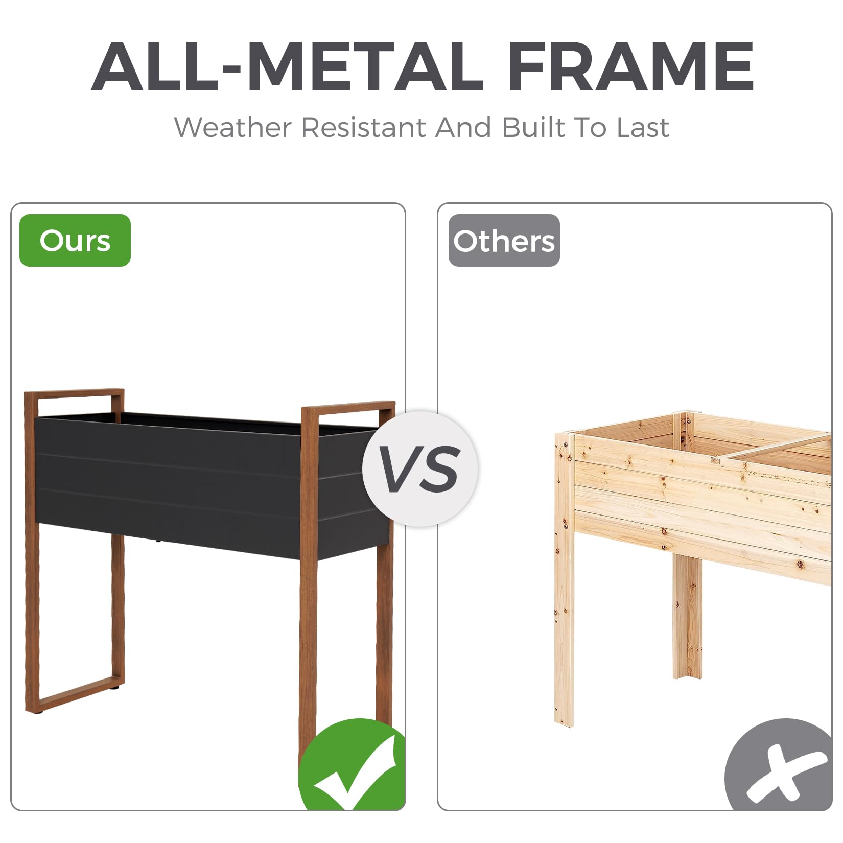 - ALL-METAL CONSTRUCTION: Our raised garden bed is supported by an all-metal frame with a premium powder-coated finish to ensure sturdiness and durability. Compared with wooden planters, this outdoor herb planter is weather and rust resistant, and will not rot or crack.