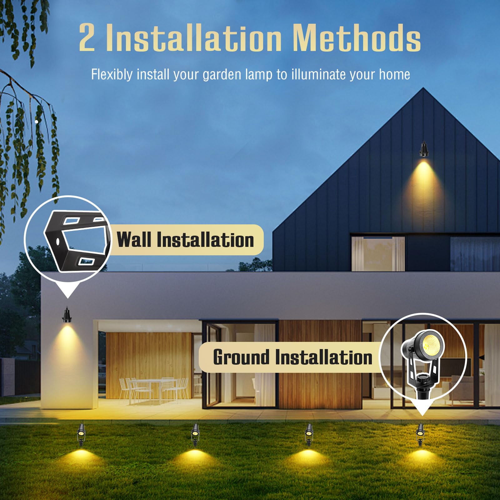 - 【2 in 1 Easy Installation】 45° beam angle, 270° adjustable head for more flexible directional lighting, you can mount the spotlights into the ground or on the wall to offer the accent lighting for the tree, flags, garden, yard, patio. The garden light kit includes clamping screw knobs and spacers and is very easy to install without any additional tools.
