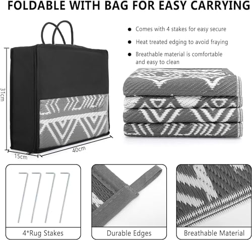 - EASY TO CLEAN & PORTABLE: This reversible outdoor rug is not only easy to clean but also highly portable. It can be folded into a compact size for easy storage and comes with a carrying bag for added convenience. Ideal for an afternoon outing or an RV road trip, this rug is a must-have for any outdoor adventure.