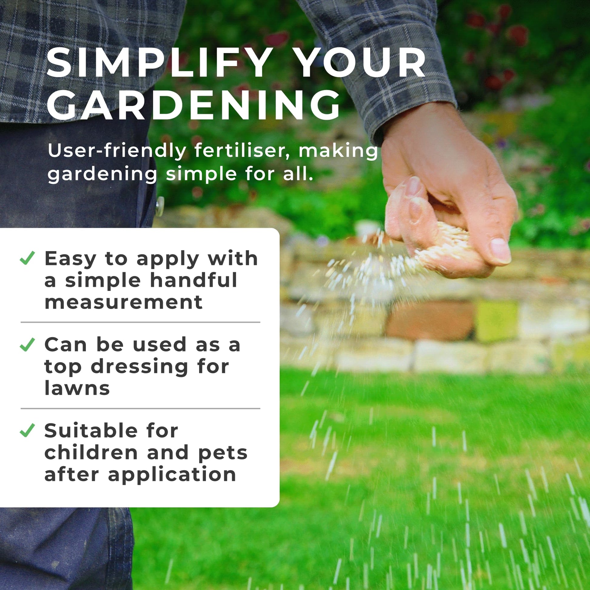 - EFFORTLESS APPLICATION – For optimal results, start by applying at the base before planting and then water thoroughly. Every 4-6 weeks, evenly sprinkle over soil or lawn, gently fork into the soil and watch your garden flourish