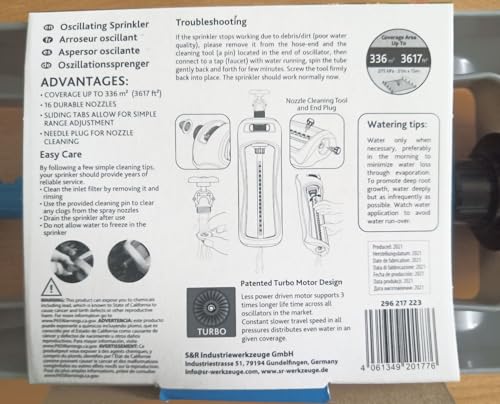 - 💦 POWERFUL & CONSISTENT IRRIGATION – Featuring 16 high-precision nozzles, the Primavera sprinkler delivers steady and effective watering for your lawn, plants, and flower beds. Includes a nozzle cleaning plug for effortless maintenance and optimal performance.