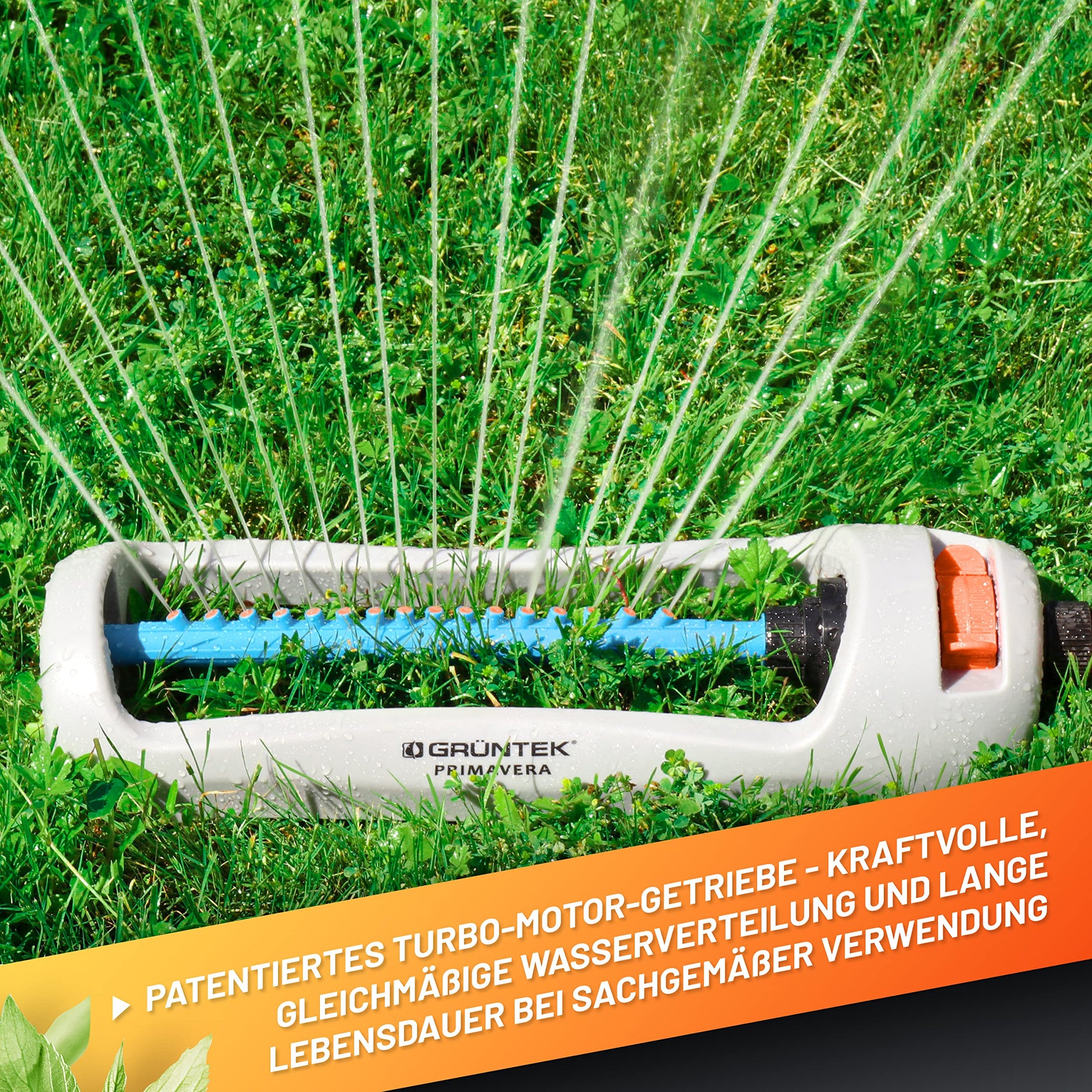 GRÜNTEK Primavera Oscillating Sprinkler – Up to 336 m² | 16 Nozzles for Even Irrigation | Adjustable Spray Width (21 m x 15 m) | Universal EU & US Connector