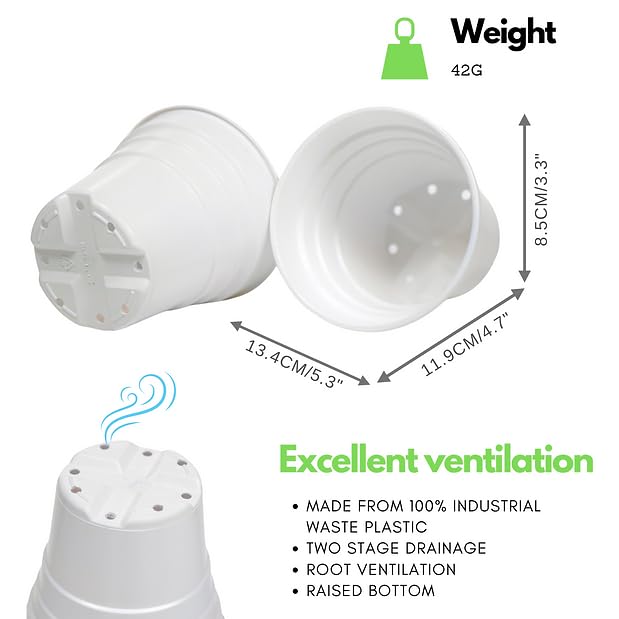 Details: These 5 ECO Happy Plant pots were manufactured in UK from Industrial waste, which was destined for landfill! Environmental Auditors approved certificate in images! The seedling pots have a diameter of 12.5cm (125mm) and are more conducive to the growth of your plants than using 15cm pots or other sizes. This also means no more waste of compost. You can put plants in these Plant pots to sprout and grow for longer than normal seed trays. This PP material is plant safe, non-toxic, environmentally friendly, heat, and cold resistance, Ideal as a material for outdoor planters. The pots have good sized drainage holes at the bottom to keep the soil drained and ventilated, which let the roots become more bigger and healthier. The plastic flower pots are made of fully recyclable plastic which, and will not be damaged easily protecting delicate seedlings, it makes it so much easier to transfer your seedlings out of, they are perfect for starter pots nice and soft.