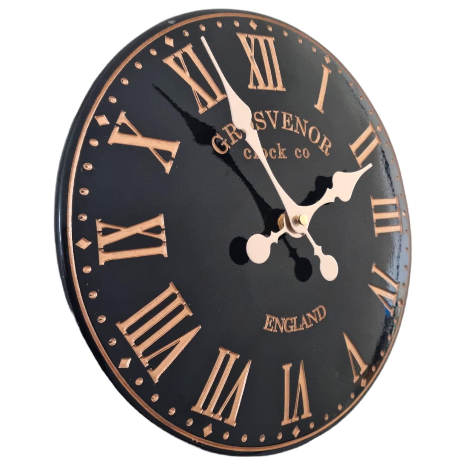 - With a black face and bold golden numerals this piece will stand out and add a vintage atmosphere to any room inside or out. This clock would also make a fabulous house warming gift for a loved one, why not share your discovery!