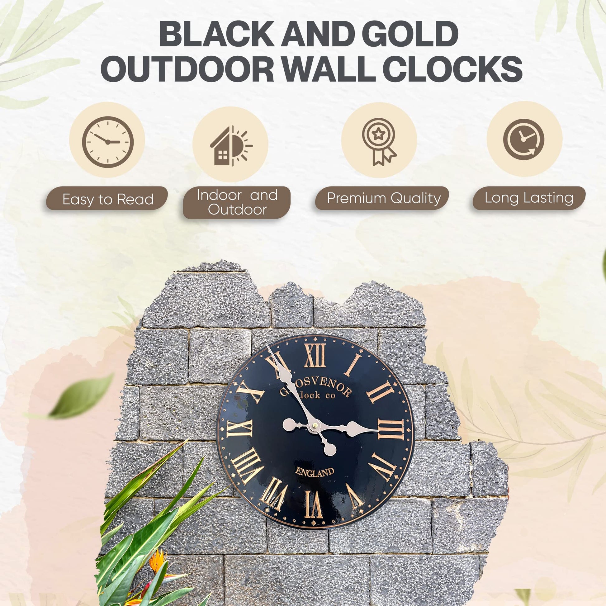 - Our black and gold detailed outdoor wall clocks are a lovely addition to any garden.
