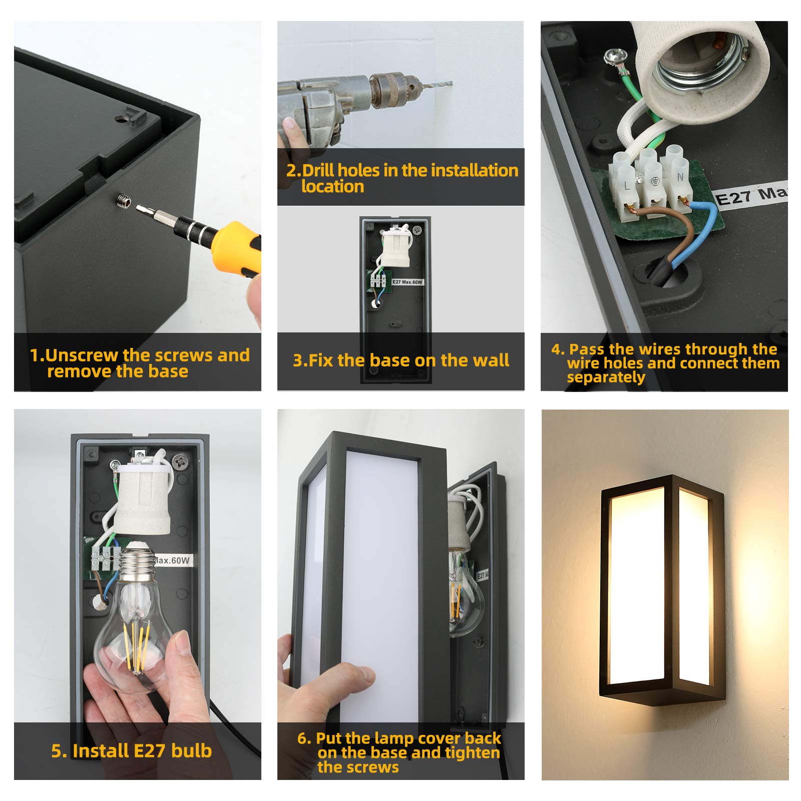 - 【EASY BULB REPLACEMENT】Swapping out light bulbs is a breeze with our outdoor wall lamp. Simply use the included Allen key to remove the wall lamp cover and replace the bulb with any E27 socket incandescent, LED, CFL, smart bulb or halogen bulb (bulb is NOT INCLUDED, Maximum power 40W). The lantern is also compatible with the majority of dimmer switches on the market.