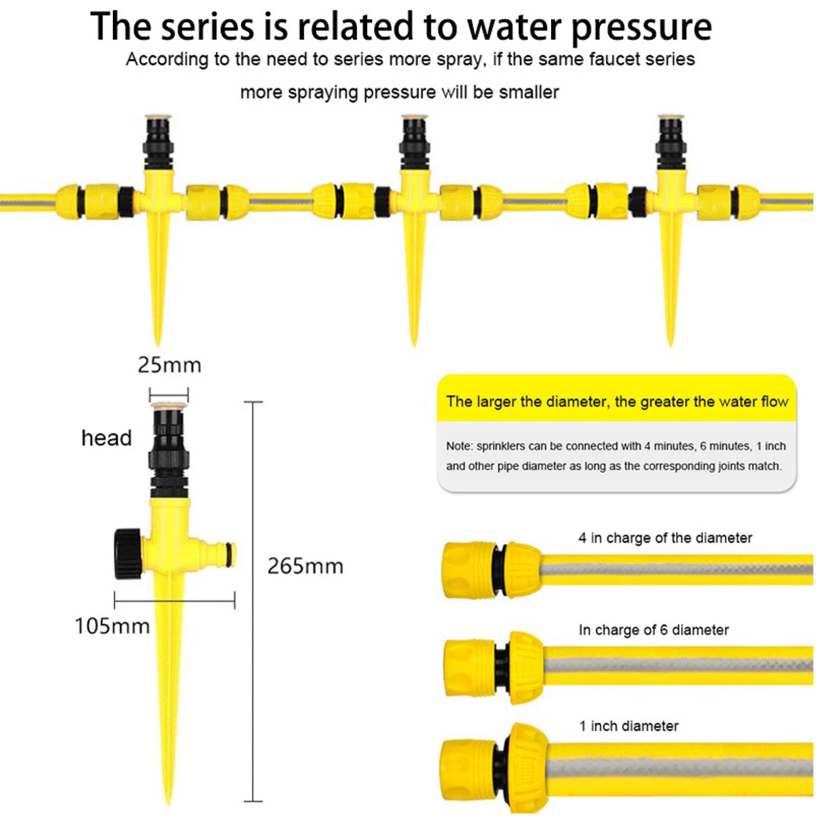 - 【360° All-round Irrigation to Free Your Hands】Simply attach the hose to quick hose connector, then connect to the lawn sprinkler system. The lawn sprinkler watering and 360 rotating action no need other auxiliary power equipment just water pressure can start, which is easy to use and quick installation.