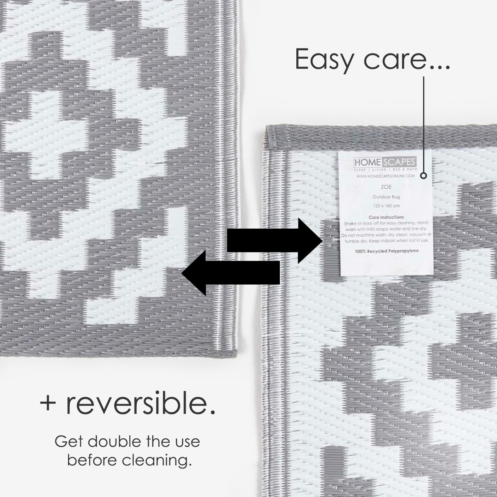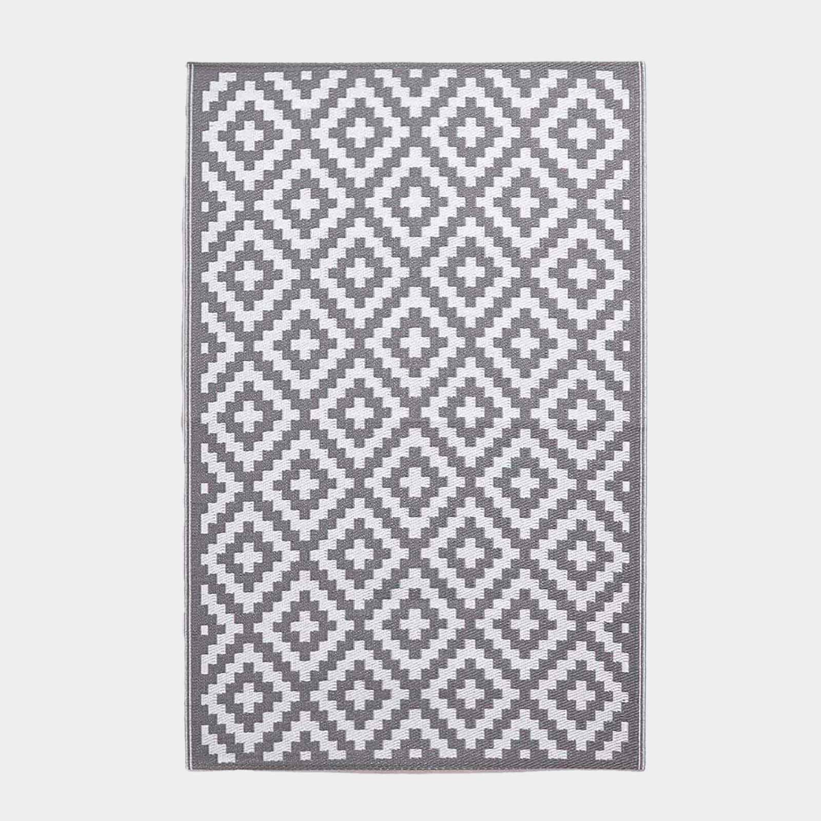 - Homescapes geometric style ‘Zoe’ grey and white woven outdoor rug for garden and patio area. Material: 100% Recycled Plastic. Colour: White and Grey.