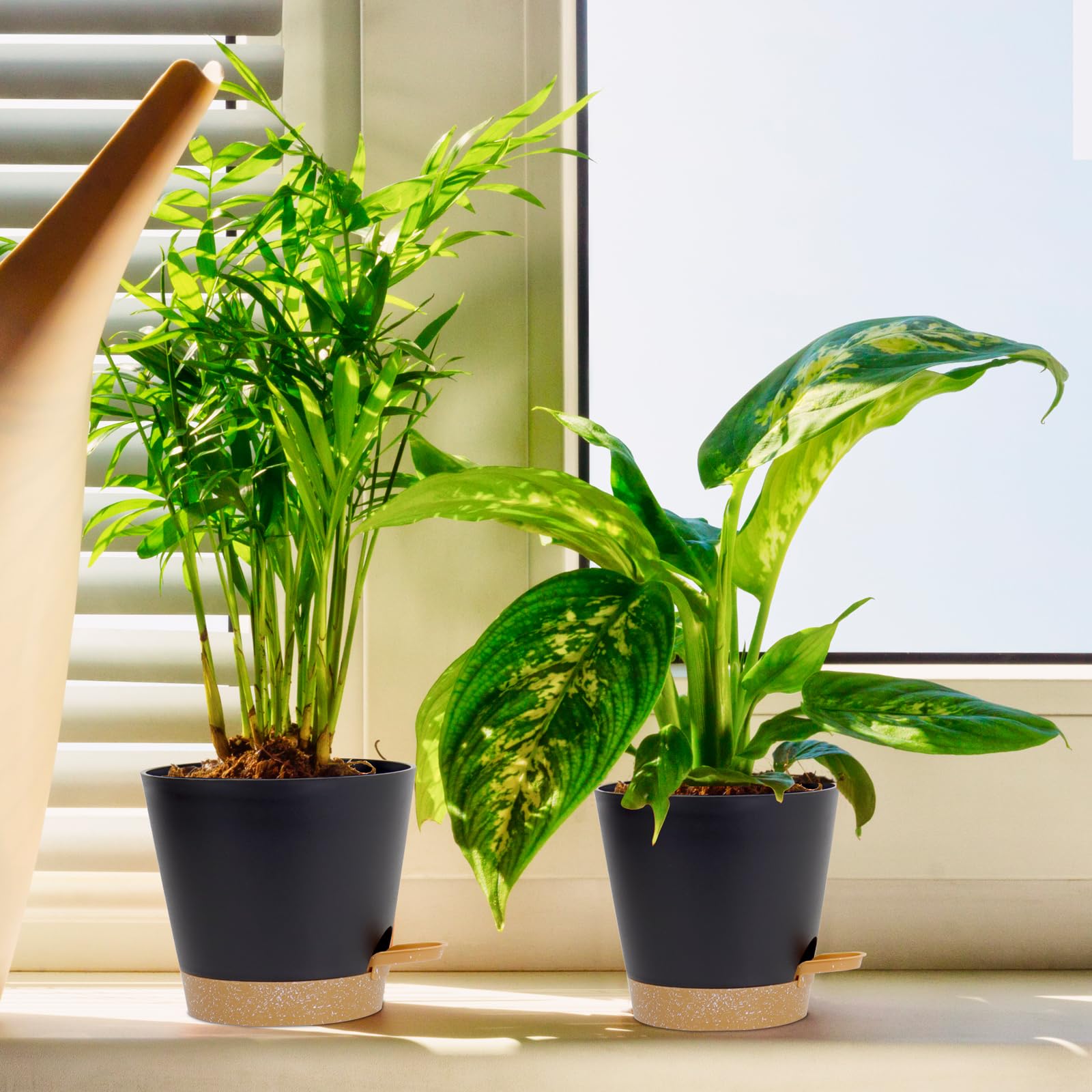 Homeuouz 6 Pack Plastic Plant Pots,Self Watering Plant Pots Indoor,20/17.5/16.5/15/14/12.5CM,Medium Flower Pots with Drainage Holes Saucer and Reservoir for All House Plants(Black)