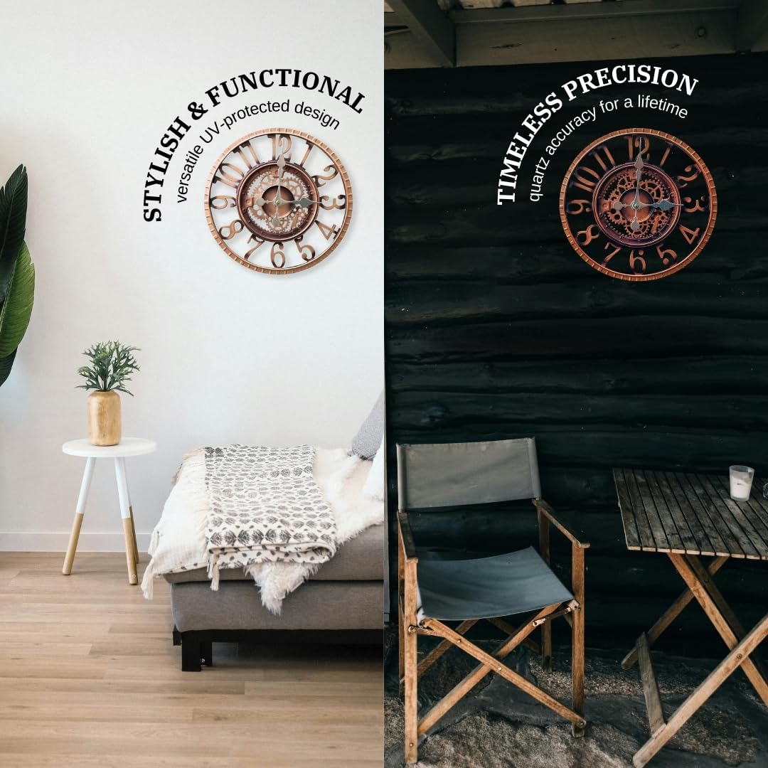 - Garden/Home Decoration - The simple and elegant design of our outdoor clock large is perfect for decorating both your indoor or outdoor space. Choose to elevate your patio, Kitchen, Livingroom, Greenhouse or garden with one of our outdoor wall clocks.