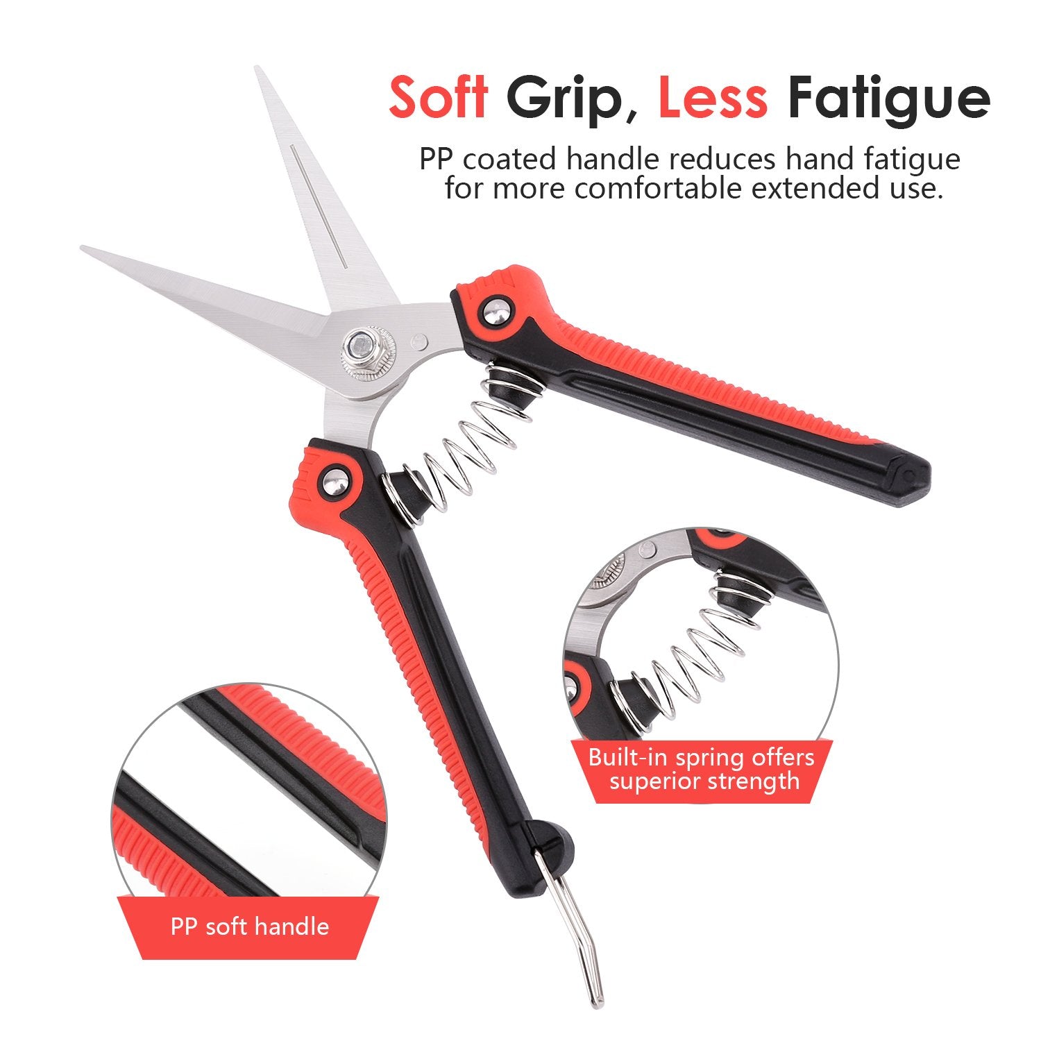 - PREMIUM MATERIAL: Pruning scissors made of high carbon steel with ultra-fine polishing technology, which is strong and abrasive resistance, the blades are heavy duty and will stay sharp for a long time.