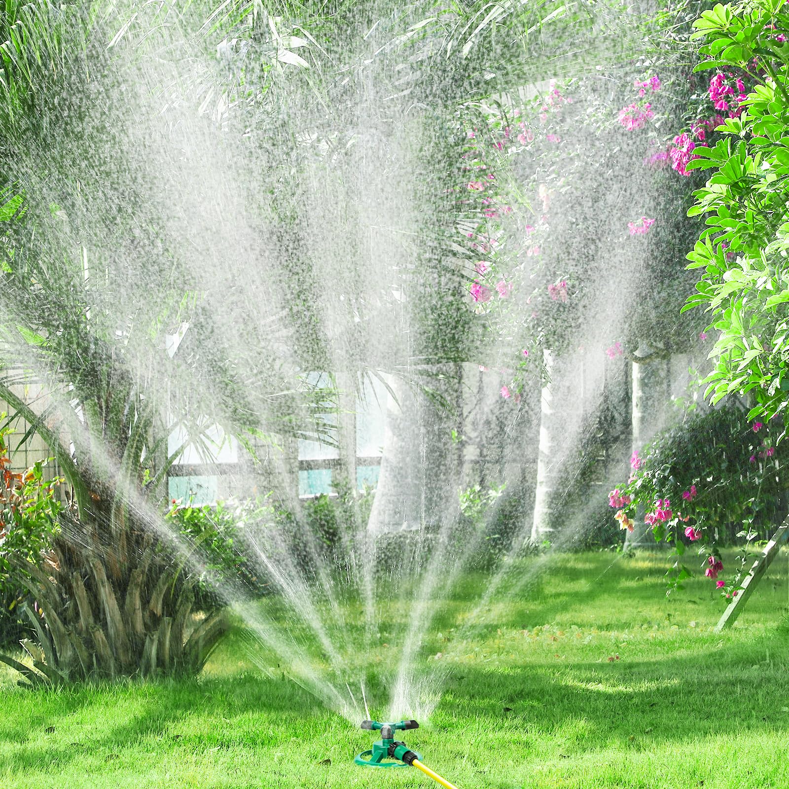- 【Effective Water Sprinkler System】Just turn on the household faucet, 3 rotating arms with spray nozzles of the lawn sprinkler automatically spray 360 degrees at a constant speed by the household water pressure.