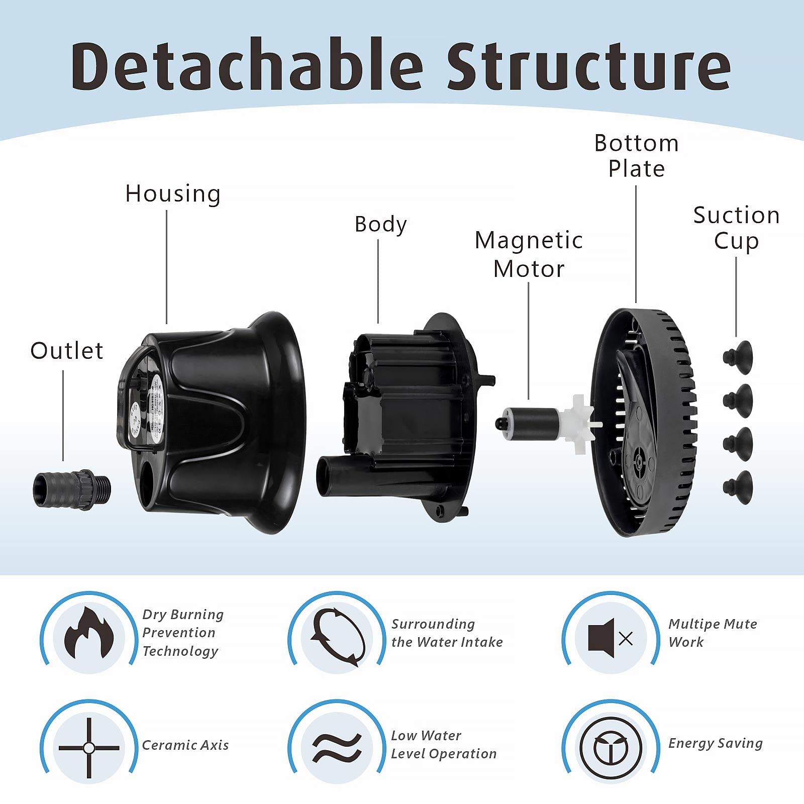 - 【Mini Water Pump】This powerful and compact water pump for fish tank is easy to use and hide.Size :14.5cm L x 11.2cm W x 16cm H.In addition, four sturdy suction cups at the bottom of the aquarium water pump silent help hold it in place.