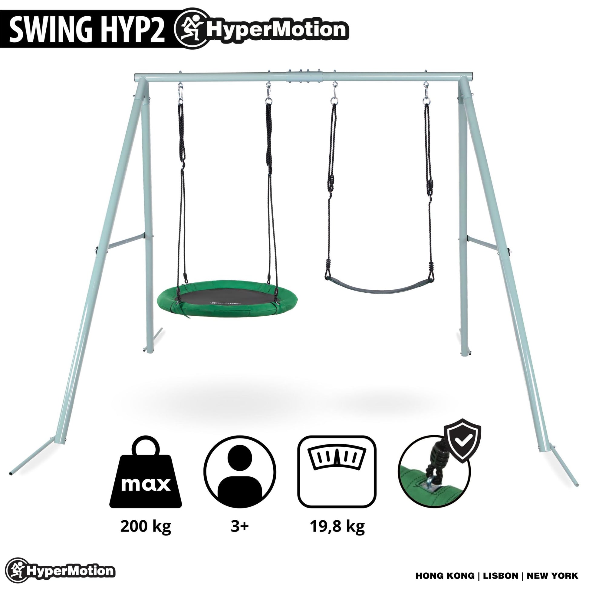 Details: Main features: swing made of durable, high-quality materials designed for 2-3 people high resistance to water, weather conditions and UV rays quick-drying properties adjustable rope length in the range of 0.85 - 1.4 m - the swing grows with the children solid A-shaped frame construction easy assembly maximum load 200 kg! modern, minimalist design in shades of dark green and gray suitable for children over 3 years of age