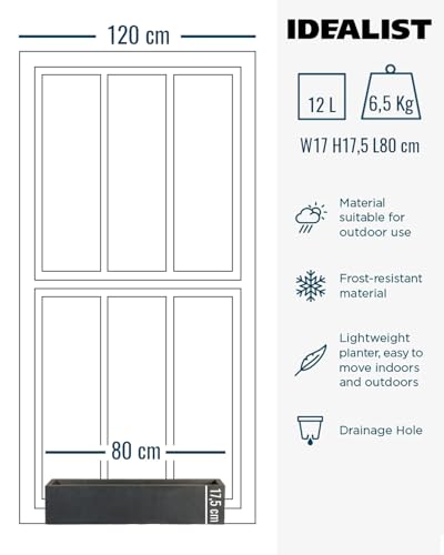 IDEALIST 80cm Long Black Window Box | Reinforced Stone Windowsill Planter | Garden Planters with Drainage Holes L80 W17 H17.5 cm, 12 litres