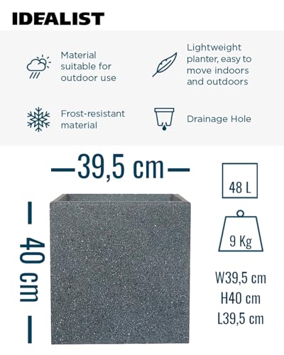 IDEALIST Plant Pots Outdoor Square Box 40 cm | Garden Planters with Drainage Holes | Grey Reinforced Stone Flower Pot L39.5 W39.5 H40 cm, 48 litres