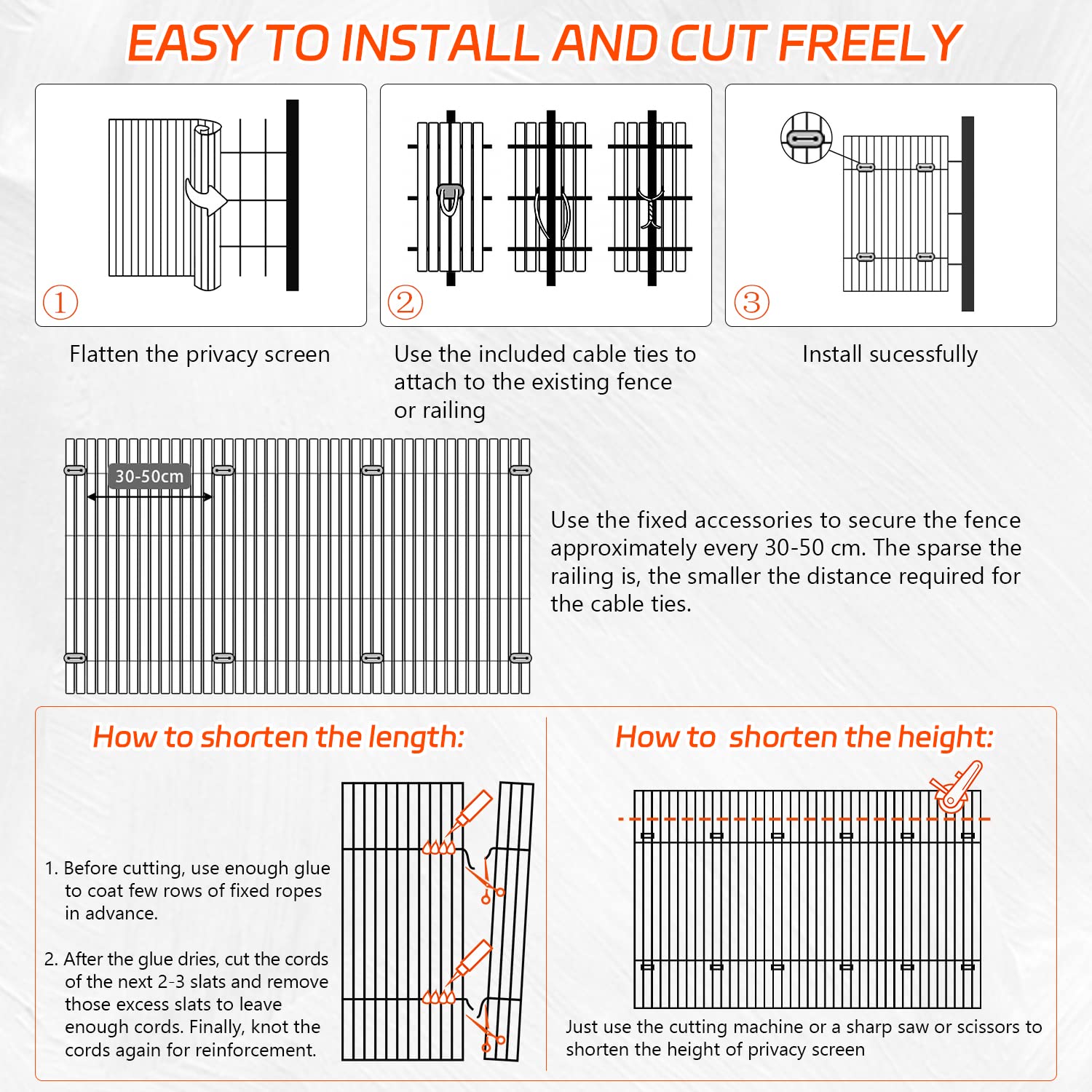 - Easy Installation: The privacy fence screening installation can't be easier, comes with 26pcs or 33pcs fixing accessories, easily attached to existing fences, railing or wall with cable ties.