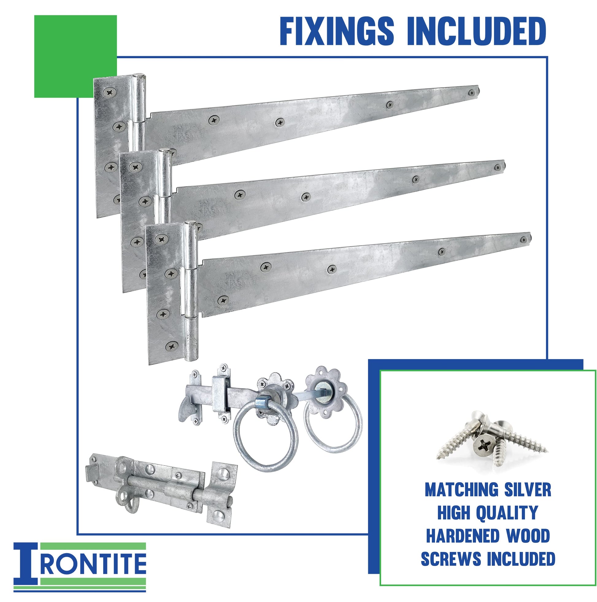 Details: PRODUCT: This IRONTITE gate fitting kit includes 450mm (18") Tee Hinges outdoor, which are heavy duty gate hinges, a ring gate latch for wooden gates, and a brenton padbolt creating a garden gate lock when used with a padlock. USES: This IRONTITE gate kit is most commonly used for house side gates, but suit a variety of uses. You get everything needed to hang your gate. The gate hardware set is for use on a wooden gate. FITTING: This IRONTITE gate furniture for wooden gates comes complete with all the necessary fixings and is surface mounted so can be fitted with intermediate DIY skills. Just the spindle for the ring garden gate latch needs a hole drilling. FINISH: These IRONTITE black hinges, gate catch, and ring latch is hot dipped galvanised giving them a durable and wear resistant finish suitable for outdoor use with long life weather protection. SECURITY: Use this IRONTITE garden gate furniture to keep your property secure. Used to keep your garden gates shut and help prevent pets and children from escaping, whilst not offering an unwanted invitation to intruders.