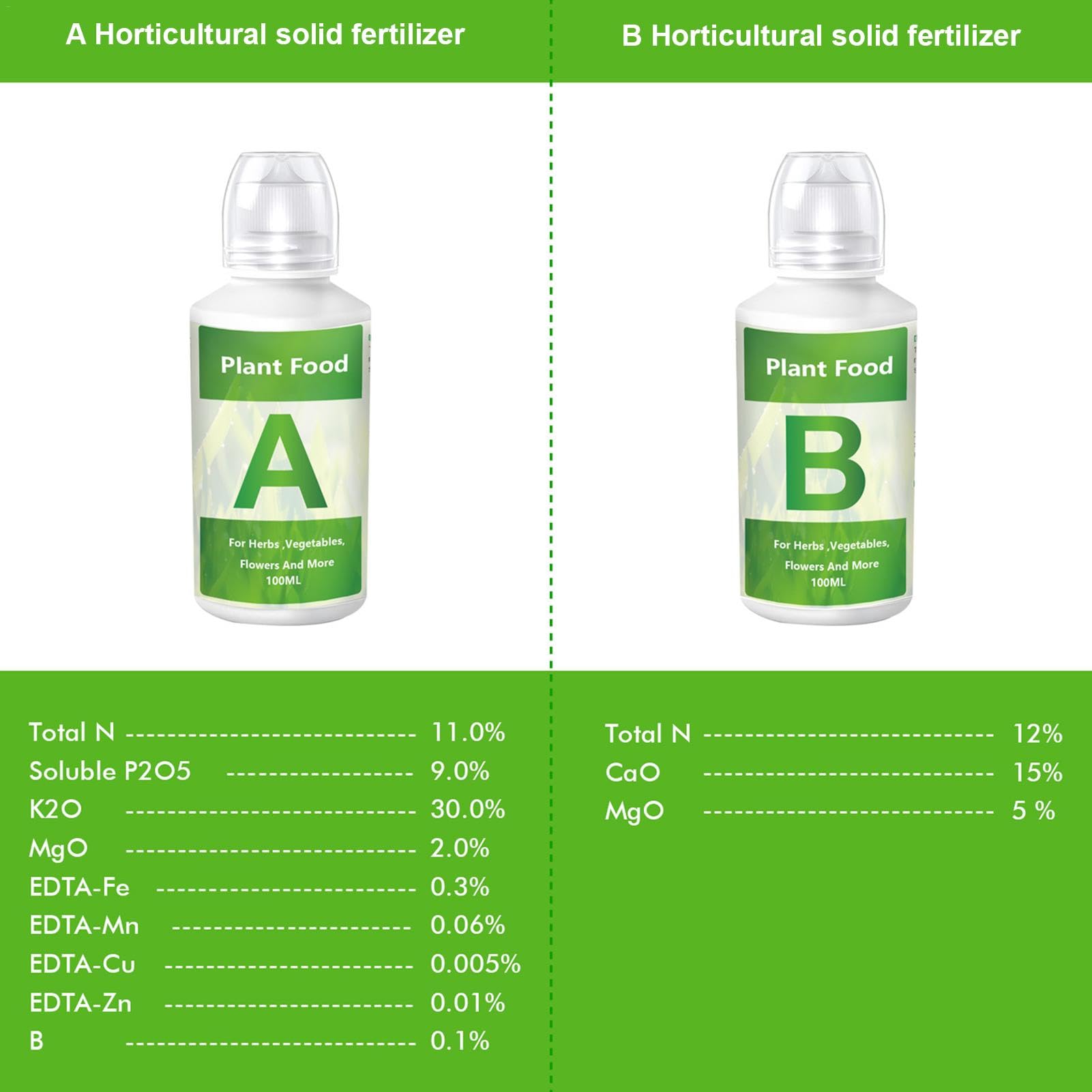 Add about 100 ml of water to each bottle and dissolve it to form the mother solution. Dilute 10 times when using, that is, 5ml A solution - 5ml B solution to 1L of water, and so on. It is forbidden to mix fertilizer A and fertilizer B directly in the solid or mother solution state. When using, the amount of fertilizer A and fertilizer B must be equal.