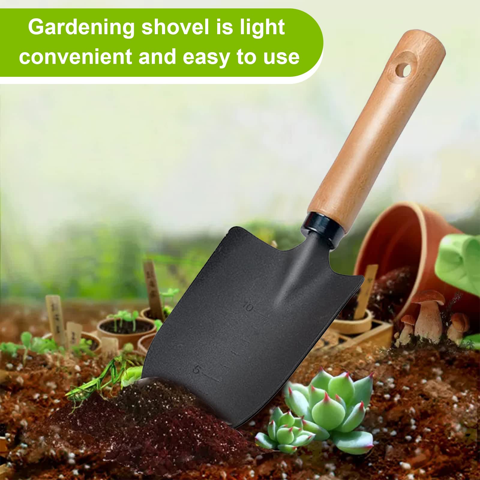 - ❤【Ergonomic Design】: The gardening small shovel is designed with ergonomic handle, the wooden handle is light in weight,comfortable to hold,can prevent fingers and wrist joints from straining,can reduce hand fatigue.There is a hanging hole in the handle for easy storage.
