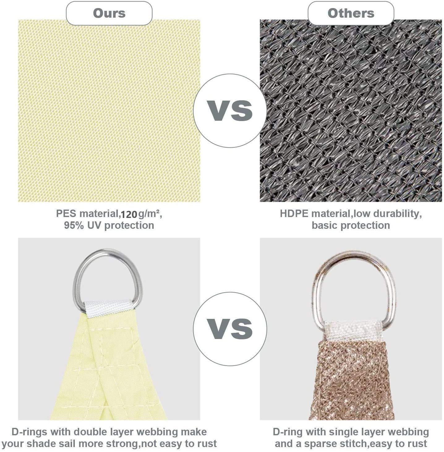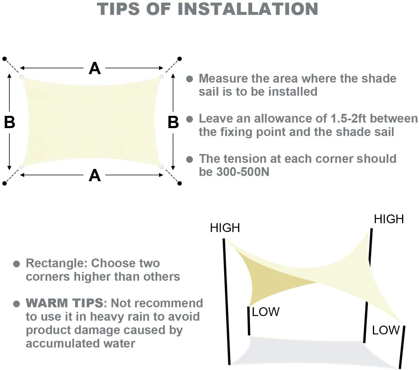 - [Size] 2.5 x 3m, with 4pcs 1m long ropes, the curved edge design can increase the tension of the shade sail and prevent sagging, and allow rainwater to flow away, prevent water accumulation