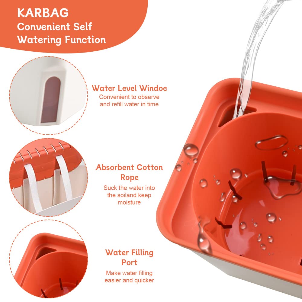 - 🌼【UNIQUE AUTOMATIC WATERING STRUCTURE】KARBAG's Self Watering Plant Pots feature a self-watering feature that separates the water reservoir and potting soil, keeping the soil and plants above the water. There are 2 slivers on the bottom to absorb and hold water, allowing your plants to be watered from the middle roots, not the top. Even if you are away from home for a few days, you can take good care of your plants and avoid them from dying due to lack of water.