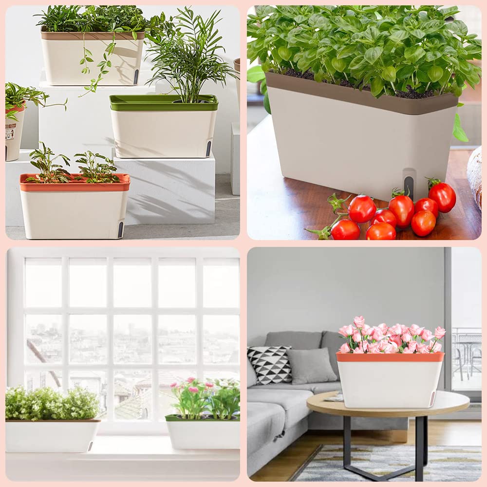 - 🌱【3 SET OF AUTOMATIC WATERING FLOWER POTS】The self watering plant pots are rectangular in design, come in 3 colors, come with 2 planting tools, simple and easy to use, suitable for any scene decoration. Perfect for narrow windowsills, our rectangular planters measure 10.6" L x 4.5" W x 5.7" H and are ideal for displaying plants indoors or out.