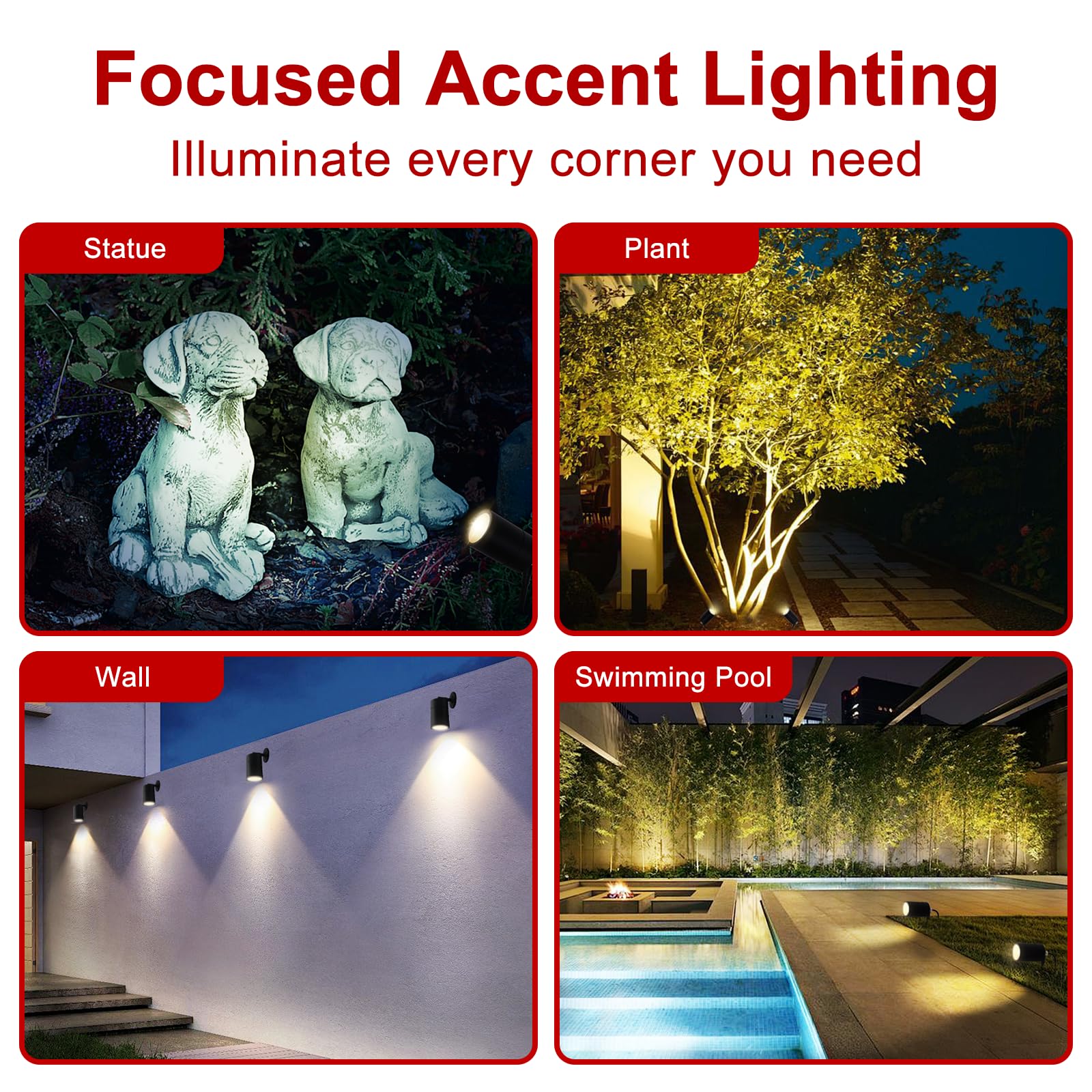 - Adjustable Light Head Angle: The vertical 90-degree adjustable angle adapts to various scenes such as Terraces, fountains, courtyards, park, and lawns, enhancing outdoor landscapes and boosting overall aesthetics