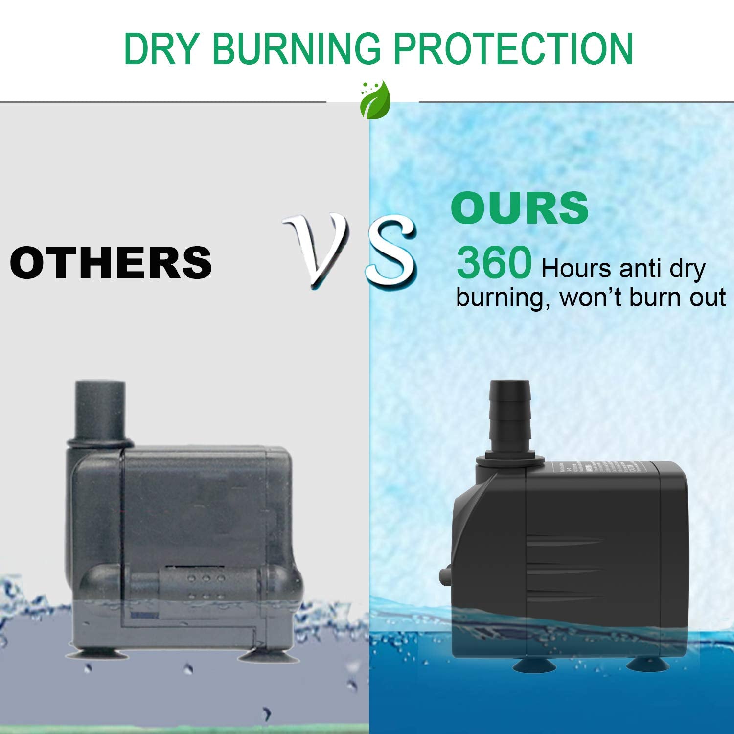 - 【DRY BURNNING PROTECTION】Considering that the users will forget to add water, we have added a temperature control protection switch inside the pump. When the pump is running-dry, it will automatically cut off the power when the temperature of pump is high,360-hour dry burnning protection,Don't worry that there is no water in your fountain, which will cause the pump to burn out.