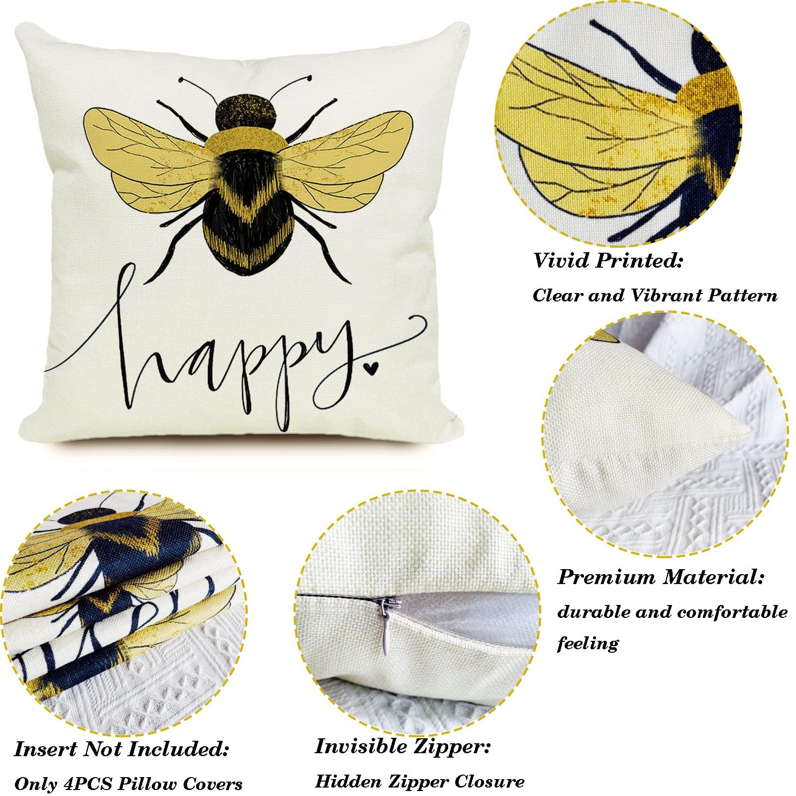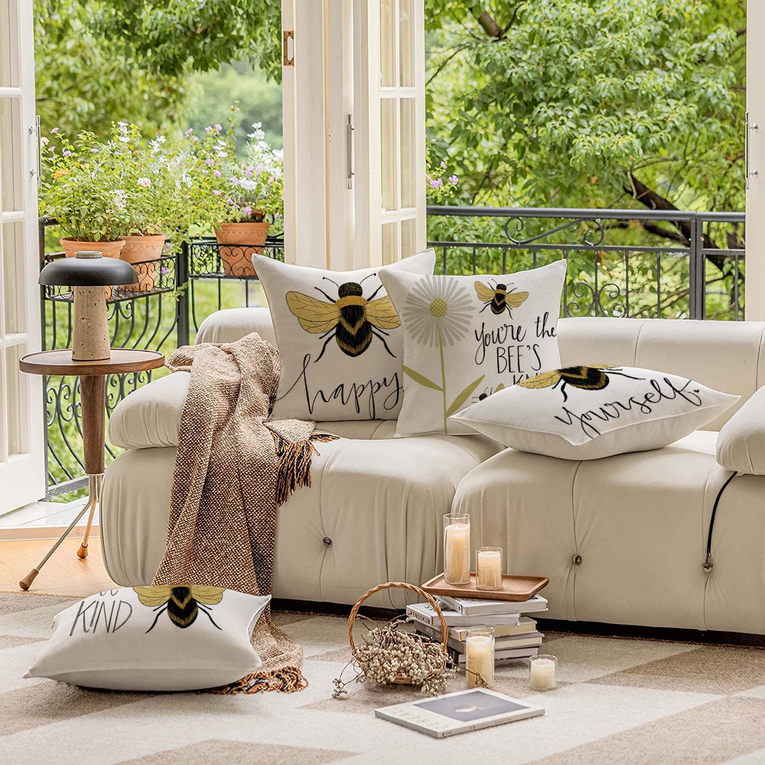 KUNQIAN Bee Cushions Cover Outdoor Waterproof Cushions Yellow Bee Pillow Covers Set of 4 Home Decorative for Sofa Linen Square Outside Office 18x18 Inch 45x45cm