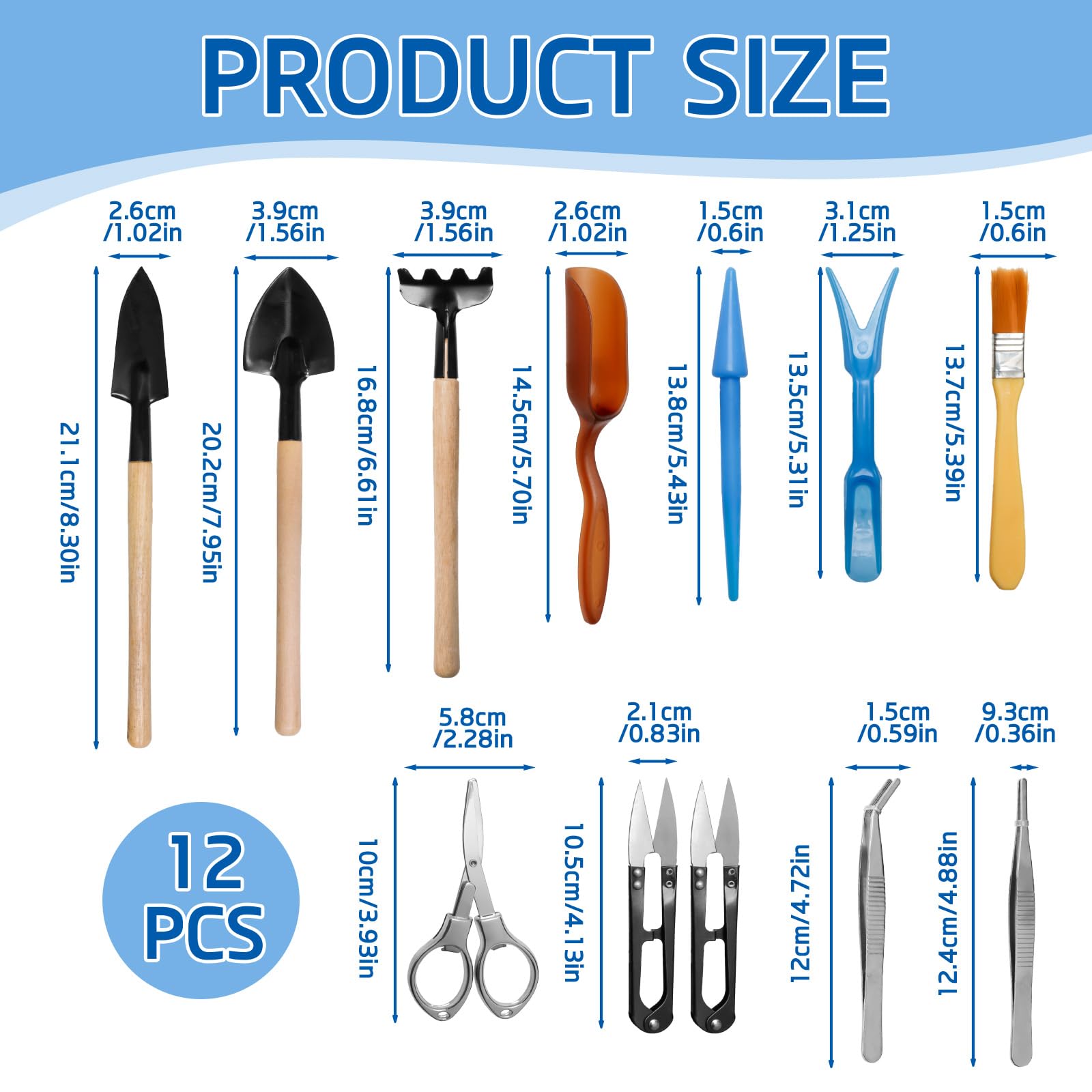 - Complete 12-Piece Gardening Tool Set Our mini gardening tool set includes everything you need to care for your plants: 1 mini rake, 2 mini spades, 1 dig seedling tool, 1 hole puncher, 1 soil shovel spoon, 1 curved-tip tweezers, 1 straight-tip tweezers, 1 cleaning brush, 2 bonsai leaf trimmers, and 1 pair of scissors. Perfect for all your gardening tasks, from digging and loosening soil to pruning and cleaning