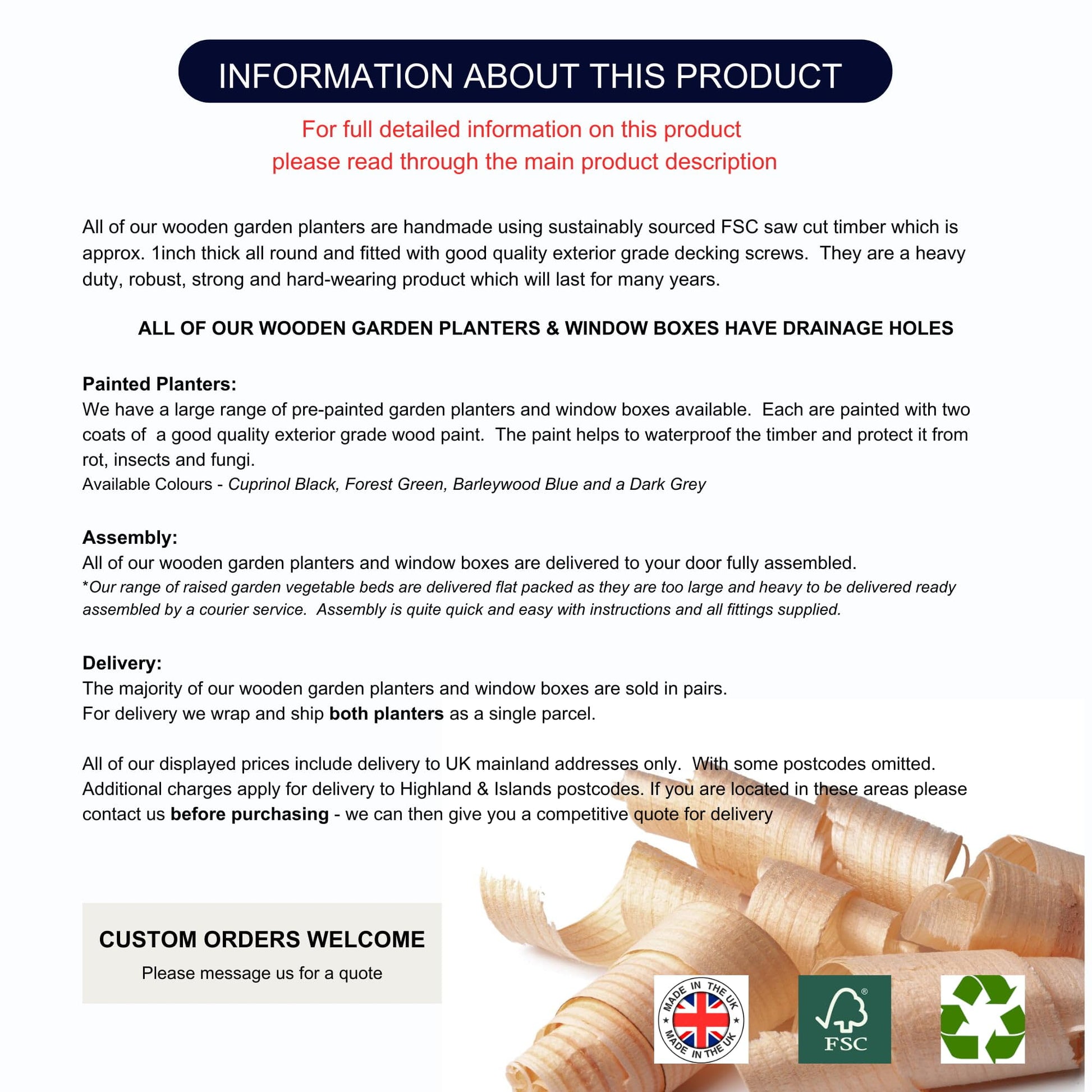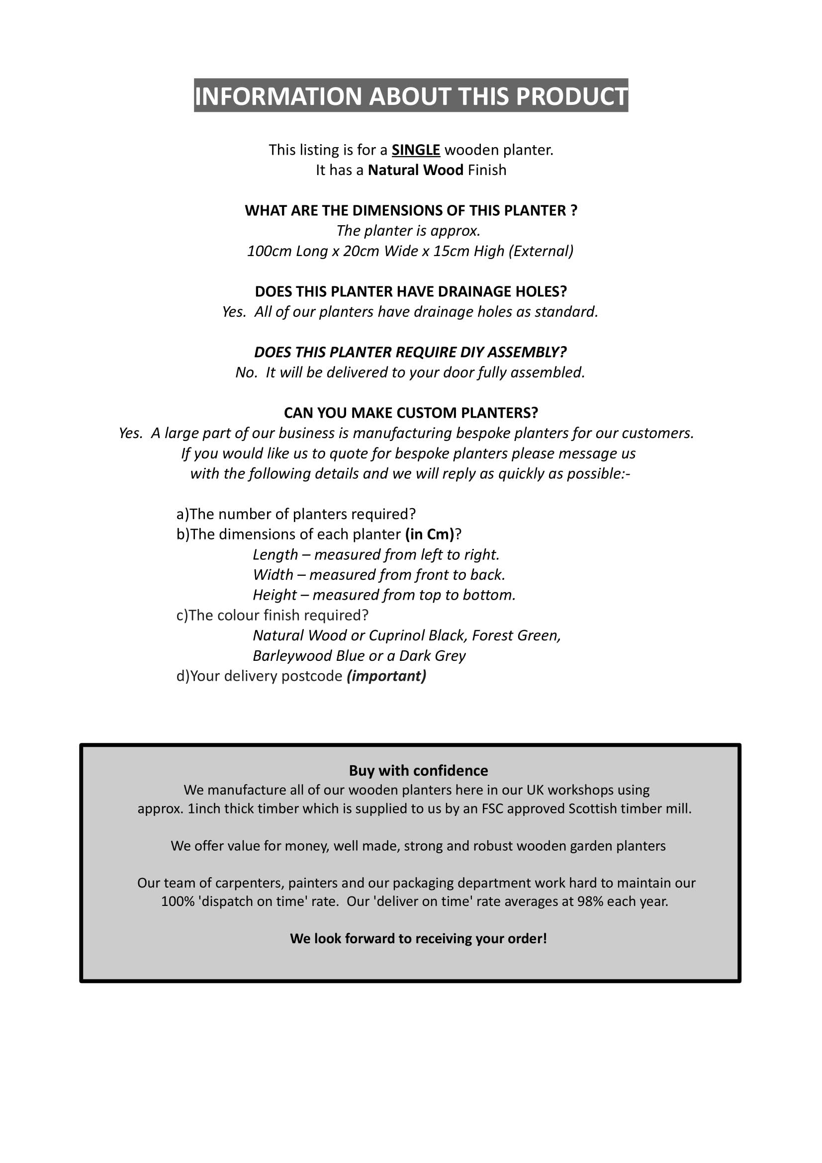 Details: Handmade garden planter using sustainably produced wood and fitted with heavy duty exterior grade screws, producing a strong and hard-wearing product. Dimensions: 100cm Long x 20cm Wide x 15cm High. Our full range of Wooden Garden Planters and Window Boxes have drainage holes and are delivered fully assembled. Ideal for home use as flower and shrub planters, herb and vegetable gardens, plus outdoor seating area's for hotels, pubs, restaurants, cafe's, florists and commercial landscapers. We have a large range of planters listed on Amazon in several different sizes in a natural wood finish or pre-painted in various colours. We welcome private and commercial Custom Orders.