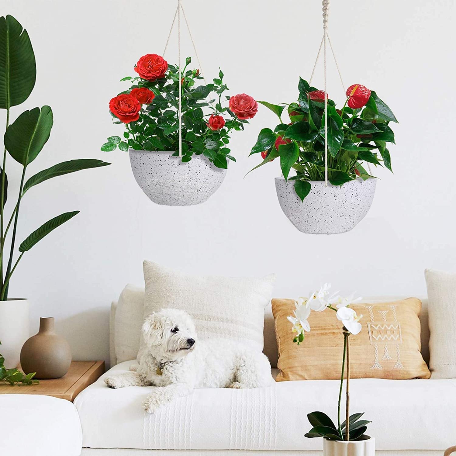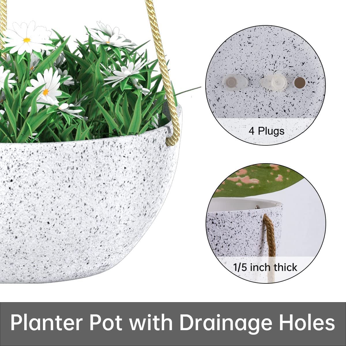 - [Speckled white] The elegant bohemian style hand-woven plant hang rope match perfectly with speckled white flower pots, the appearance of imitation concrete makes these hanging flower pots look natural and unique