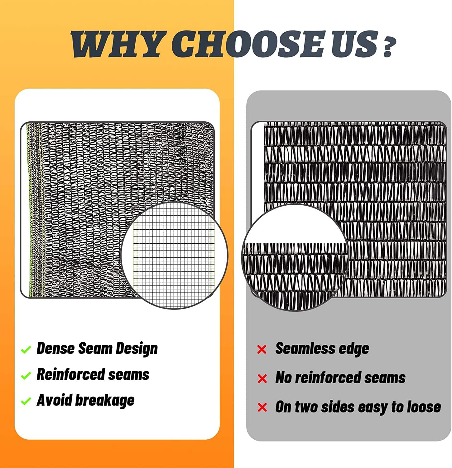 - Made of high density polyethylene, flat seam weaving and reinforced edges, to prevent unraveling and accumulating, tear resistant and breathable.