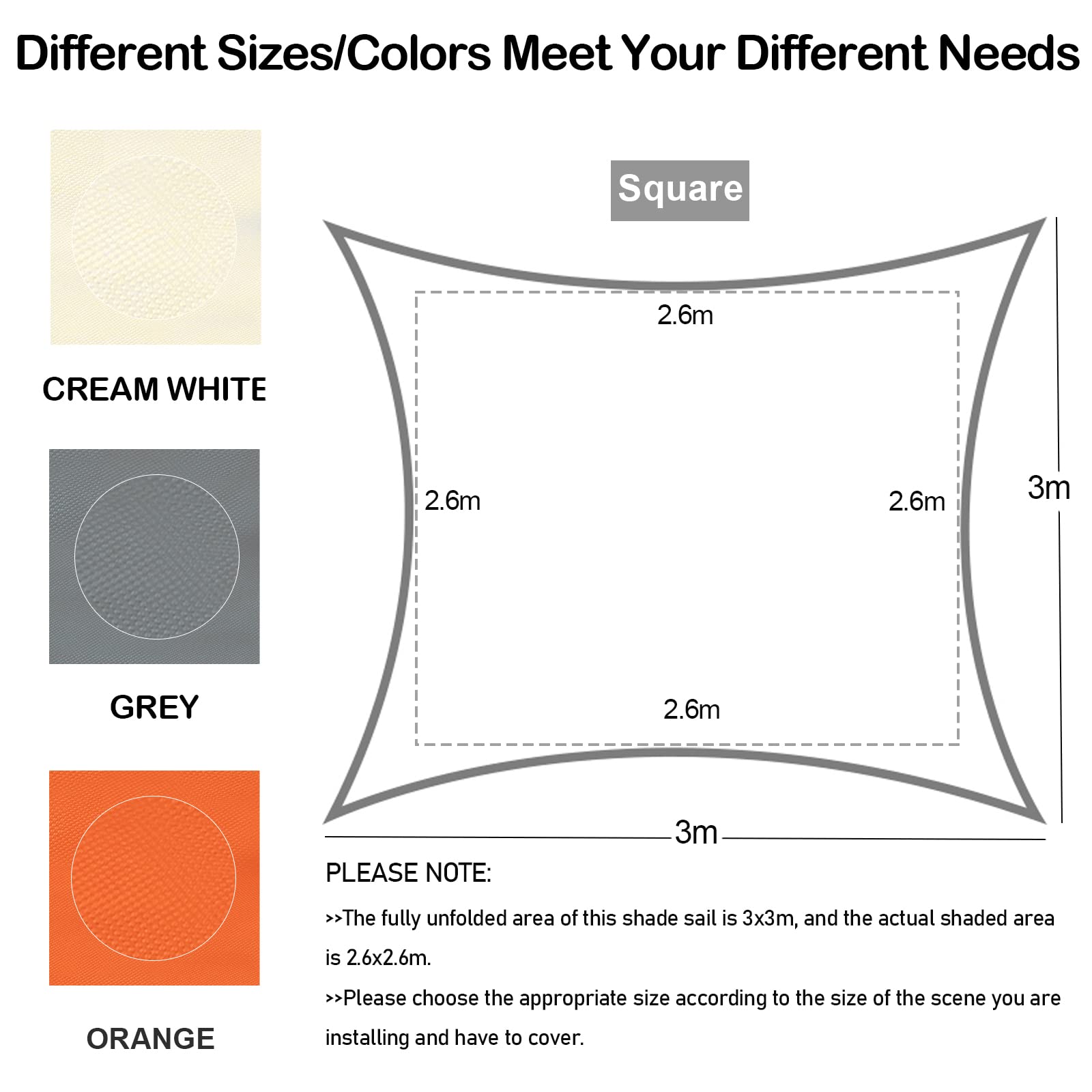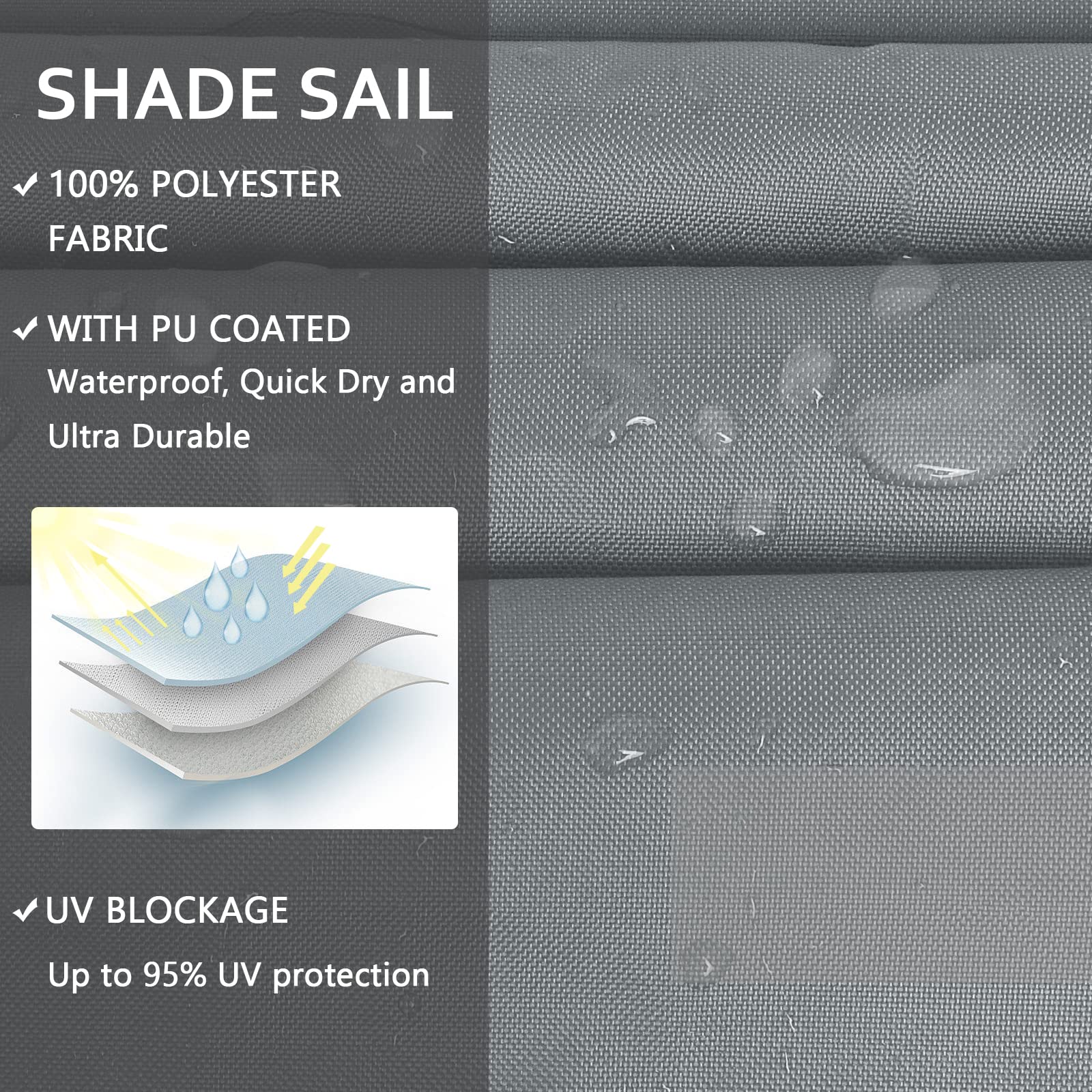 - WATER RESISTANT: Sun shade sail is 420D high density polyester fabric with PU coating(160 g/m²), can withstand 2000MM water pressure. It's tear resistant, waterproof and weatherproof. But we don't suggest to use shade sail in heavy rain, continuous heavy rain may cause slight water seepage.