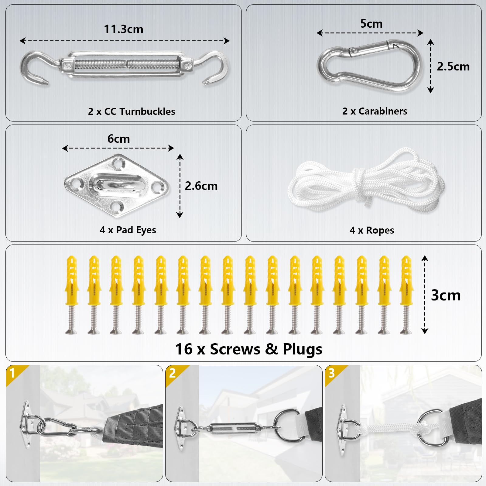 - Packing Include: Hardware kit includes 2 x CC Turnbuckles, 2 x Carabiners, 4 x Pad Eyes, 16 x Screws and Plugs. Sunshade sail includes 1 x awning canopy, 4 x ropes, 1 x packing carry bag.