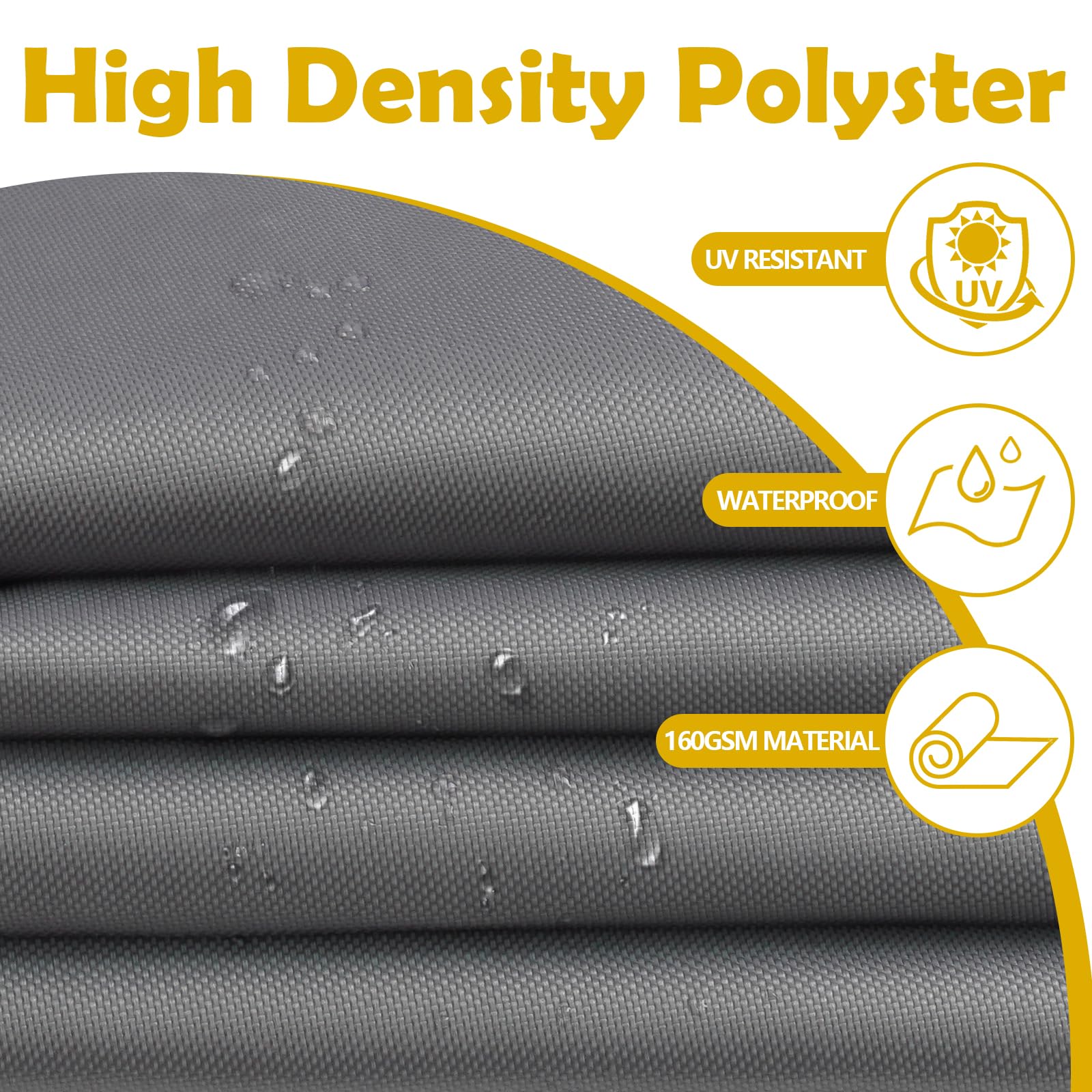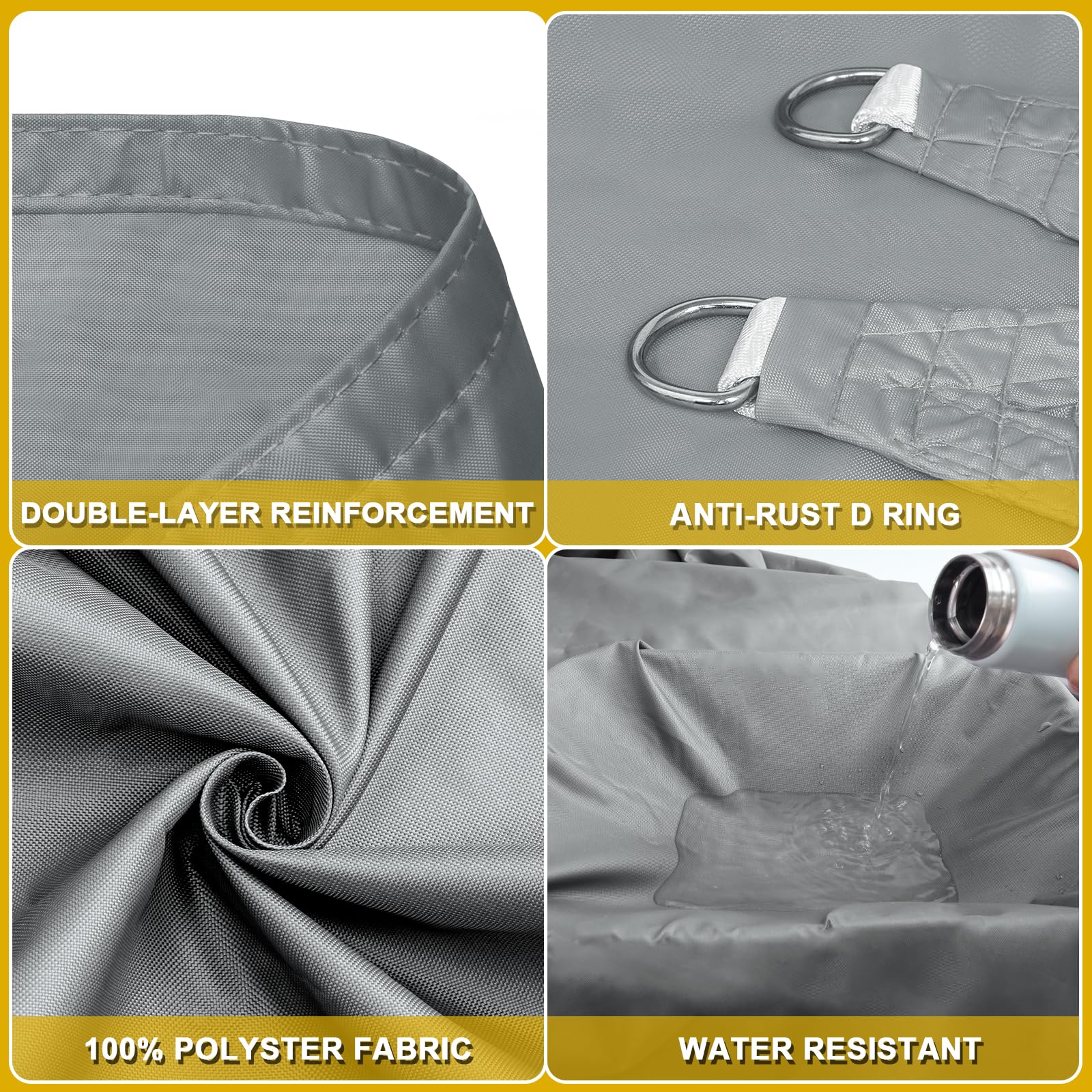 - Waterproof: Our outdoor canopy is constructed from 420D high density polyester fabric with PU coating(160 g/m²), and can resist water pressure up to 2000 mm. It's tear resistant, waterproof and weatherproof. But we don't suggest to use shade sails in heavy rain, continuous heavy rain may cause slight water seepage.