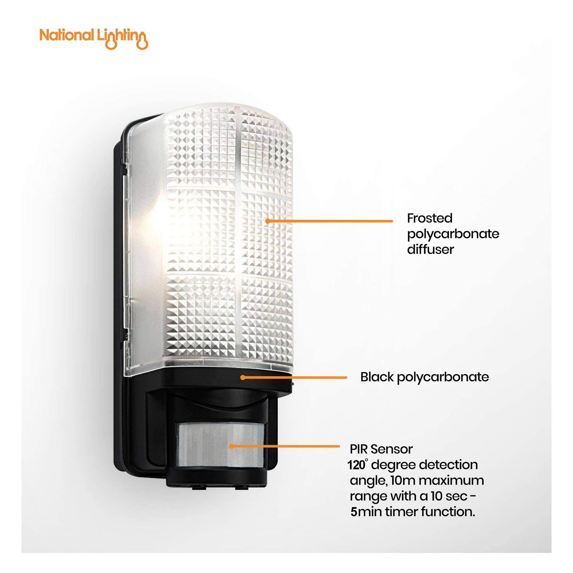 Illuminate your front porch, patio, or garden with National Lighting's MOTION. This sturdy wall lamp with motion sensor features a black plastic with a frosted plastic screen construction ideal for outdoor use. It's the perfect light fitting for your garage's side or back doors. Durable and good value, it's definitely worth your money.