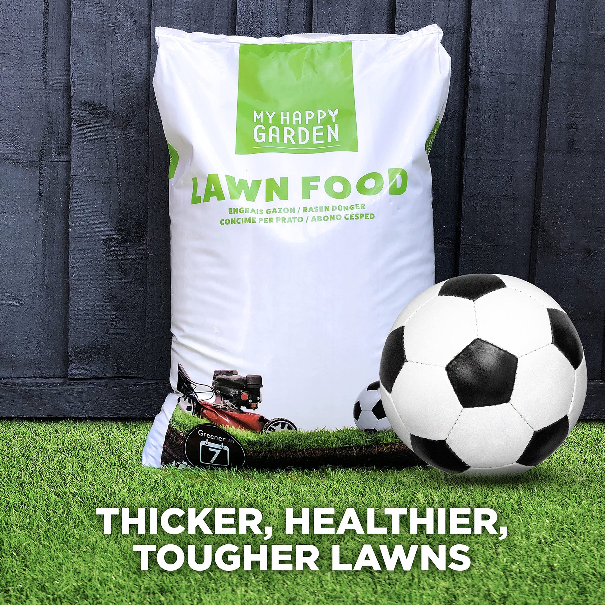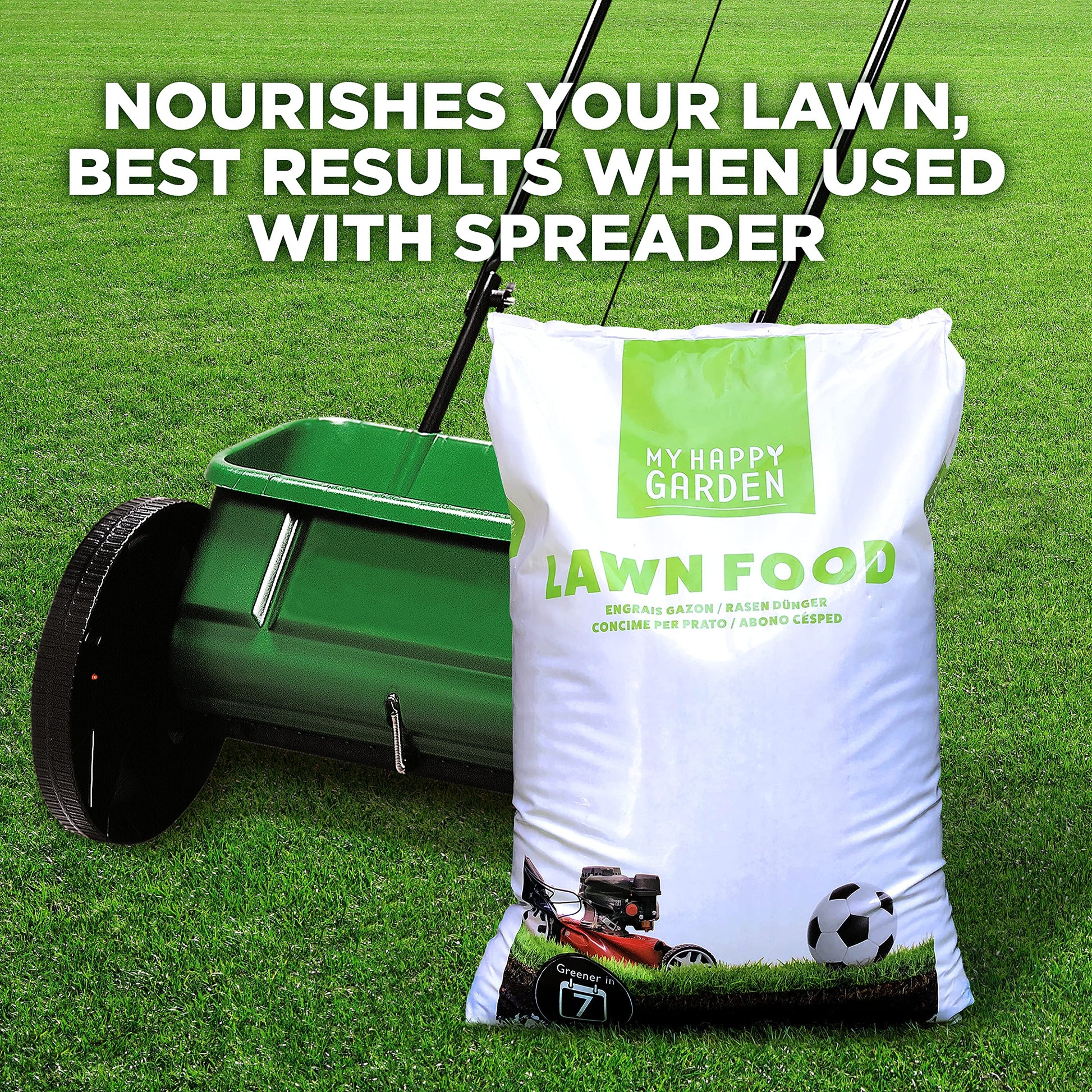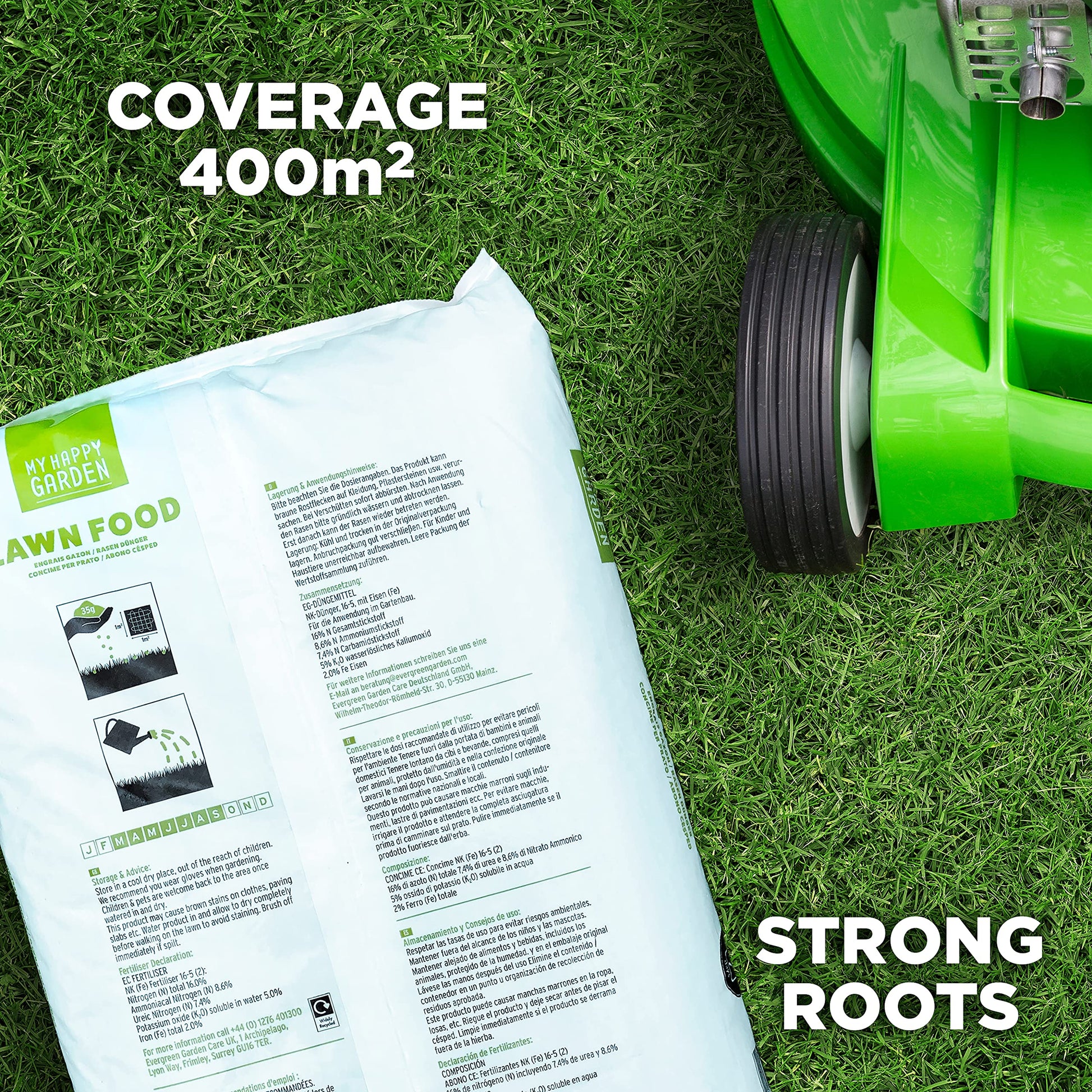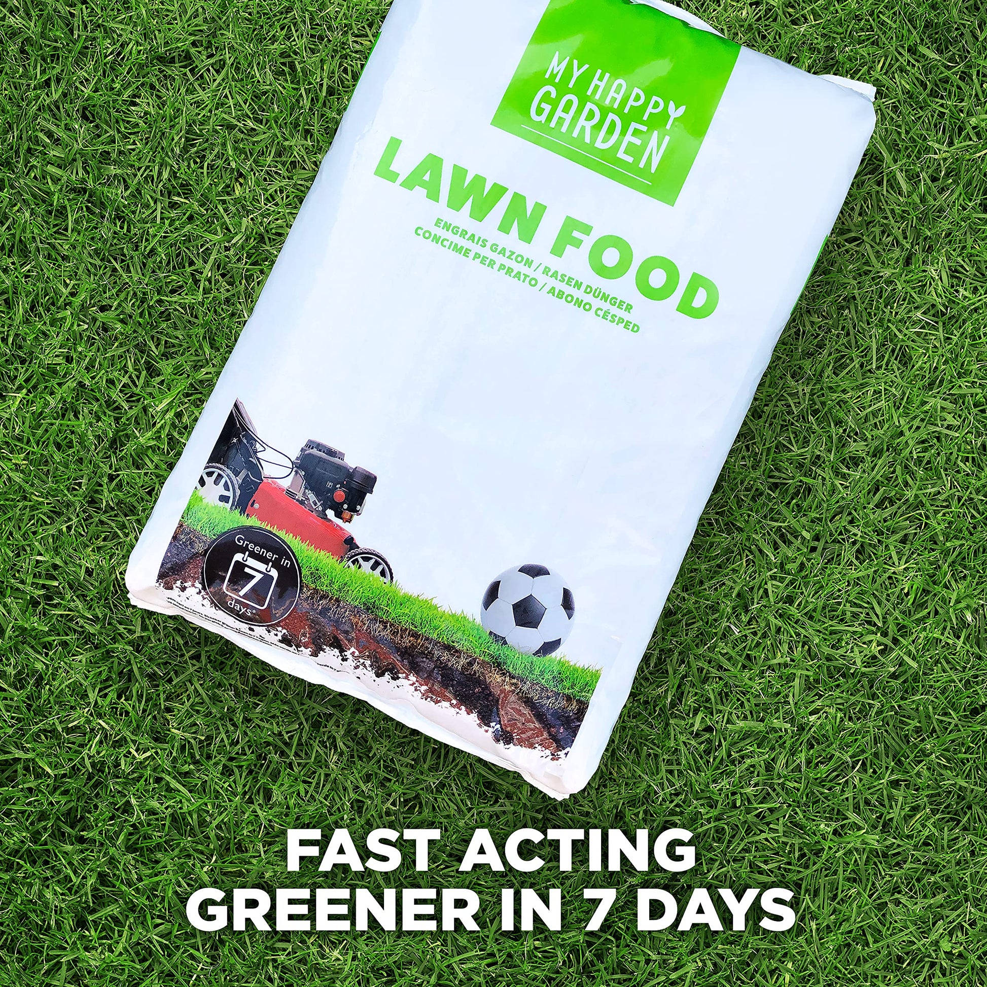 My Happy Garden Lawn food nourishes your lawn, strengthens roots, and provides a quick, deep-greening effect