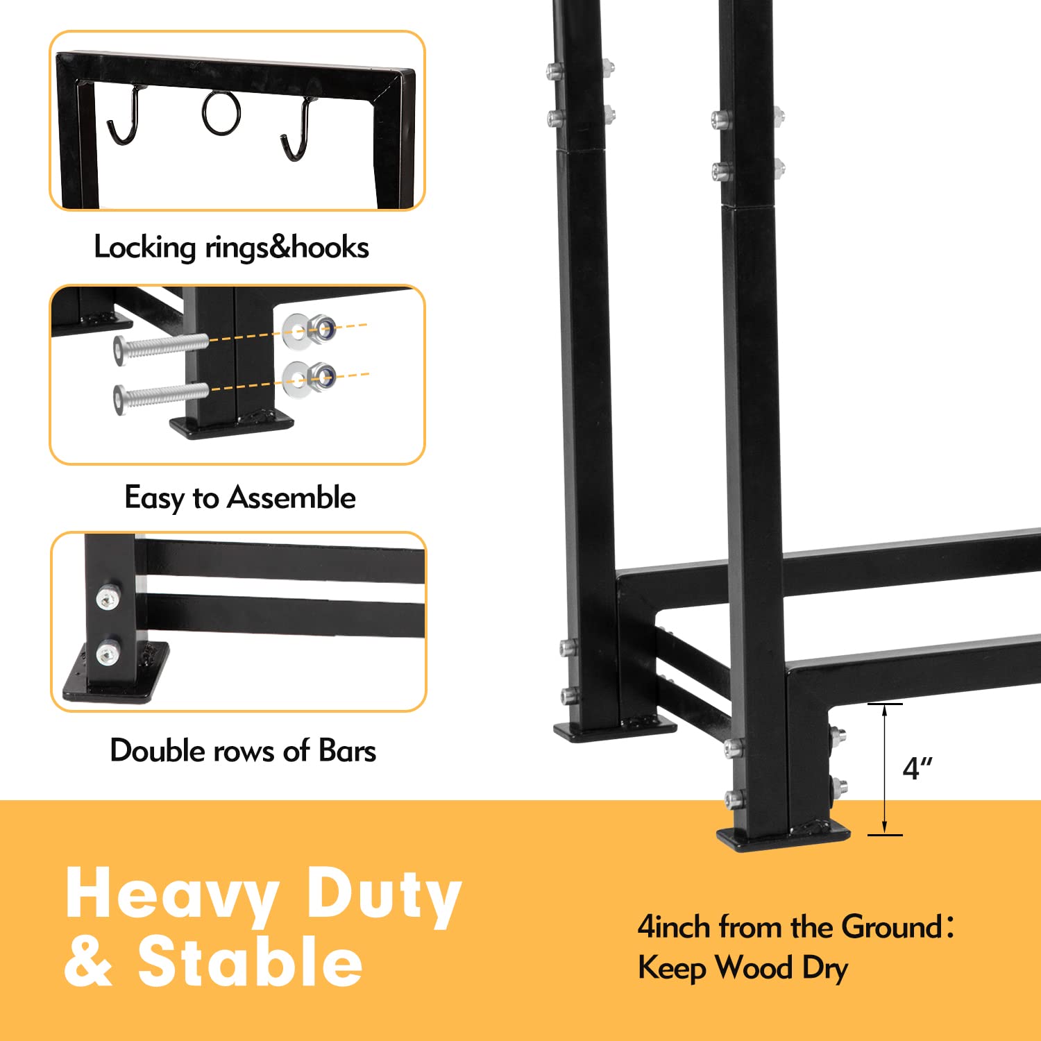 - PREVENT TIPPING OVER - Features 2 prevent tipping lock rings and 8 solid rack legs, that means we take more care for the safe of your families. Secure the rack reliably and effectively prevent tipping over of the heavy firewoods, Just lock up the rack with extra prevent tipping straps and put the rack on a hard surface.